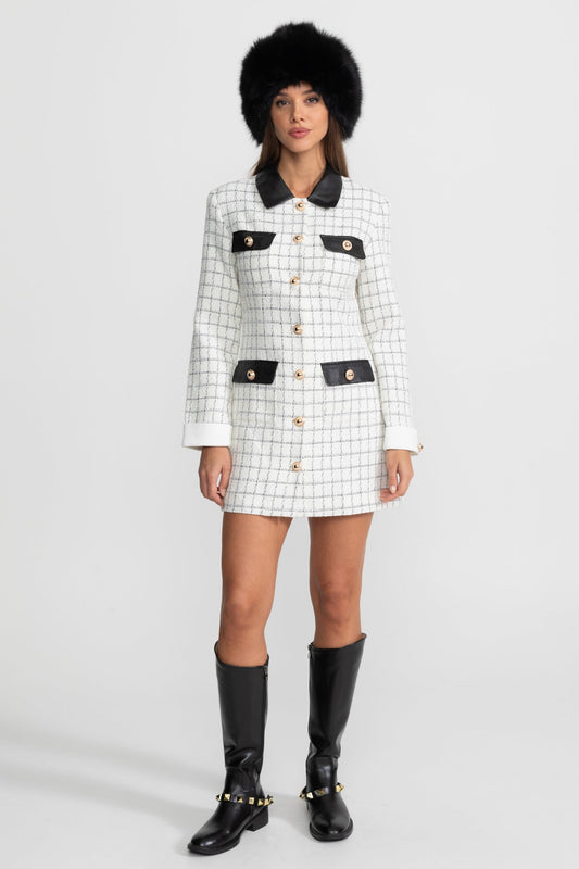 Kontrast Deri Detaylara Sahip Uzun Kollu Tweed Mini Elbise – Beyaz Ve Siyah