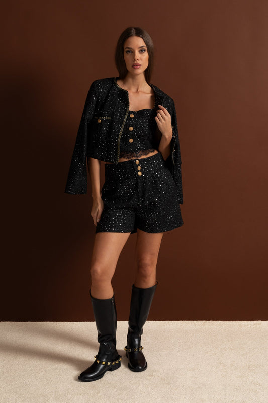 Kısa Ceket, Dantel Üst Ve Yüksek Bel Şorttan Oluşan Süslemeli 3 Parçalı Takım – Siyah