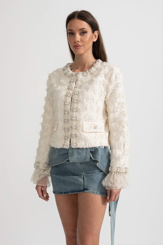 İnci Ve Kristal Süslemeli Dokulu Ceket Üstü - Fildişi