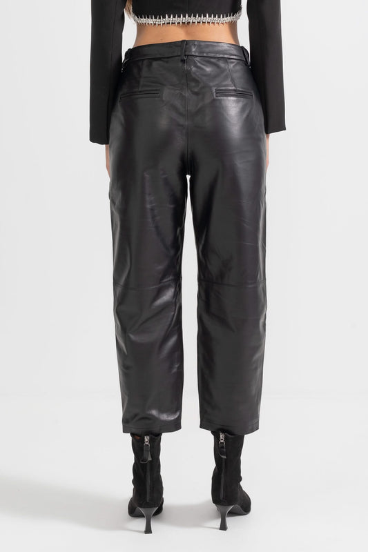34% İndirimDekoratif Dikişli Deri Düz Paça Pantolon - Siyah