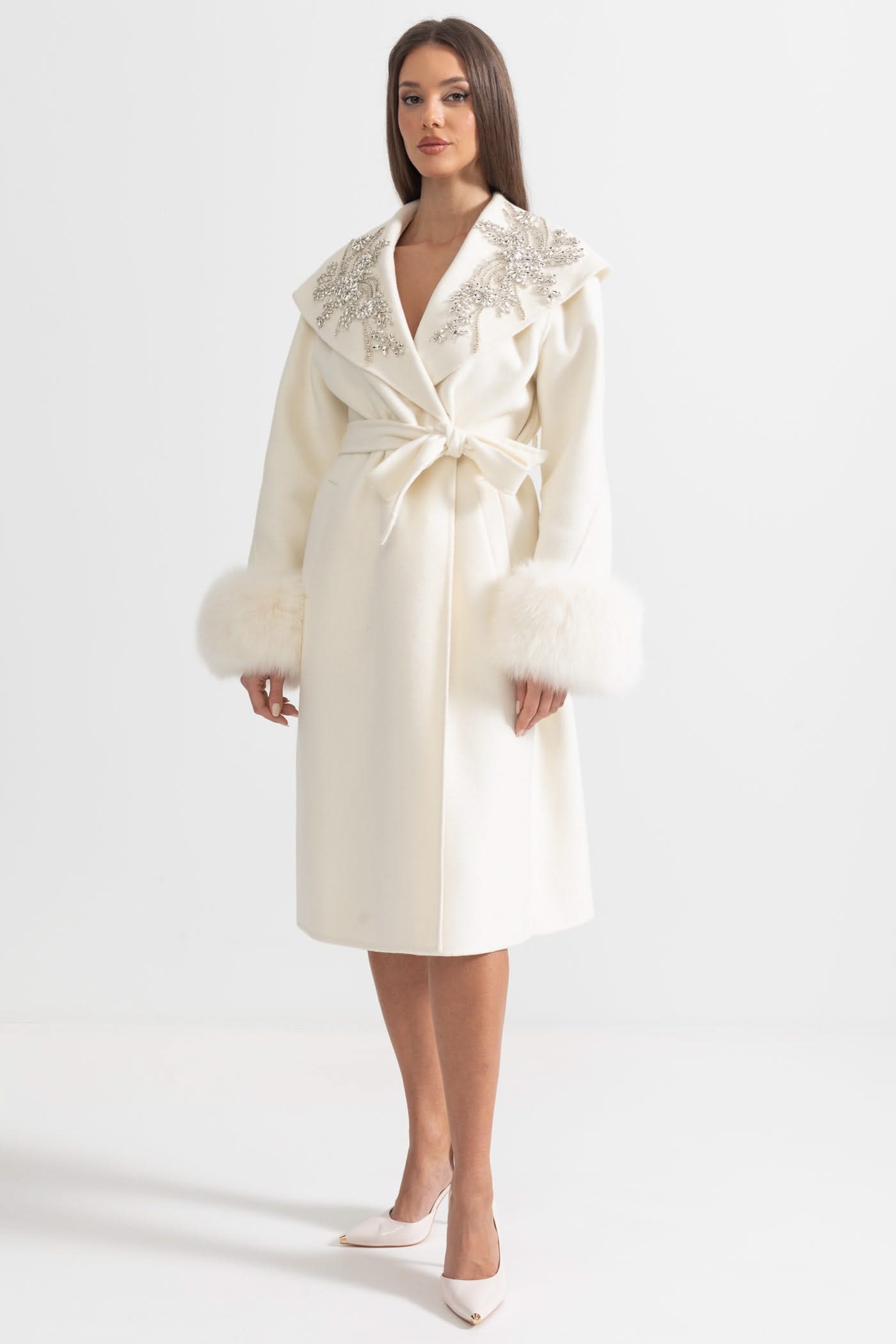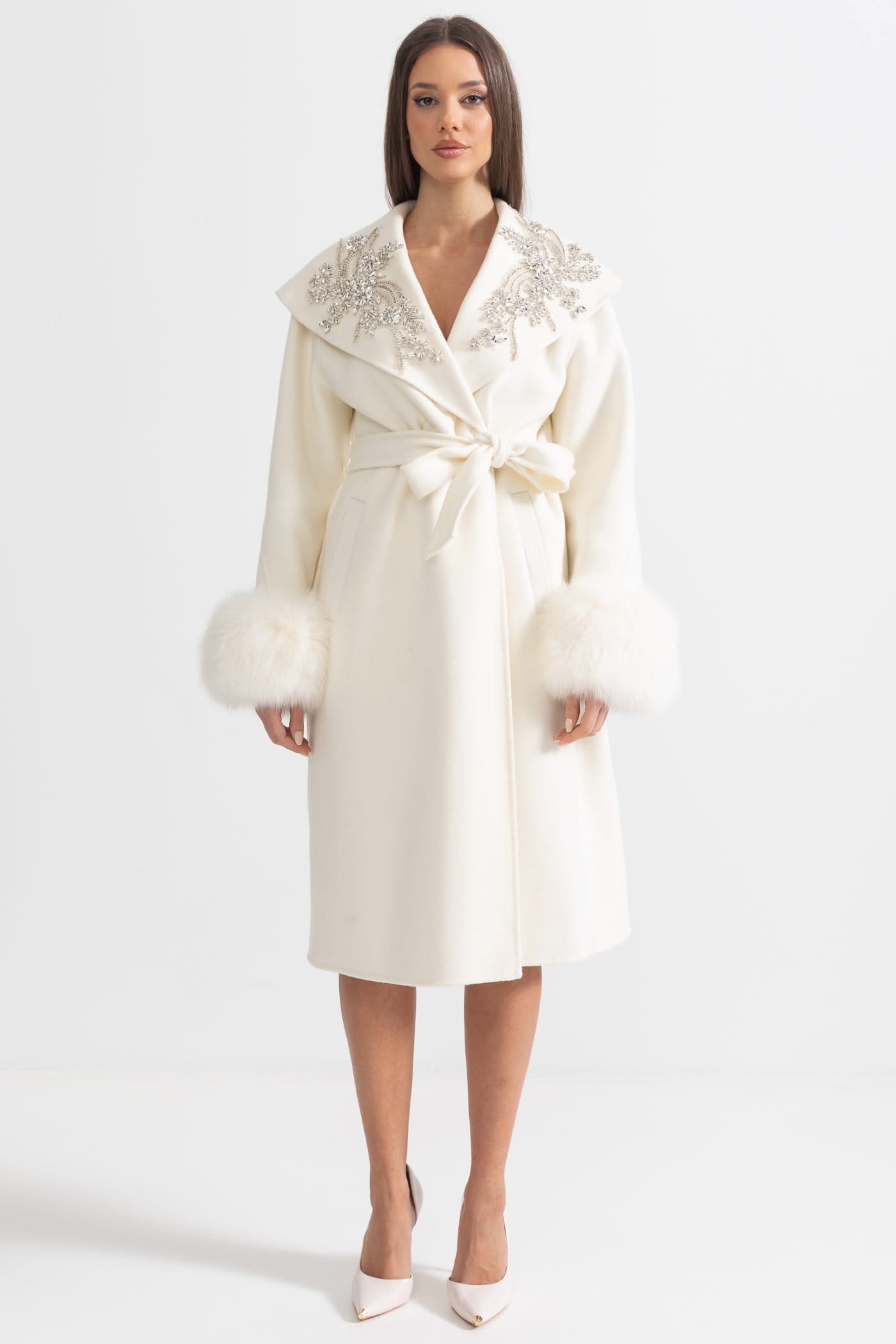 Tilki Kürk Manşetleri Ve 3D Çiçek Detaylarıyla Kaşmir Palto - Fildişi