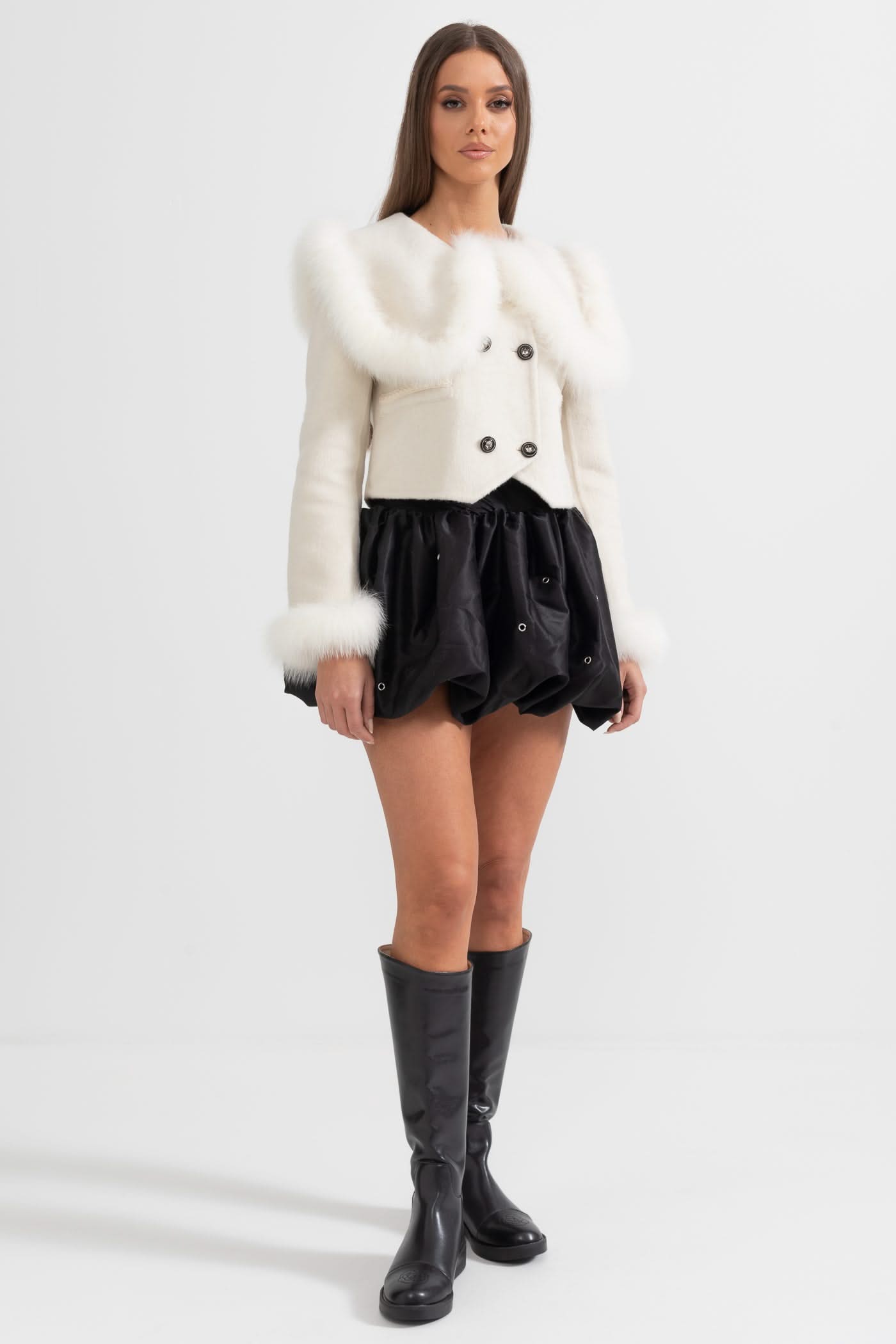 Kürk Yaka Süslemeli Çift Yaka Kırpılmış Ceket - Beyaz