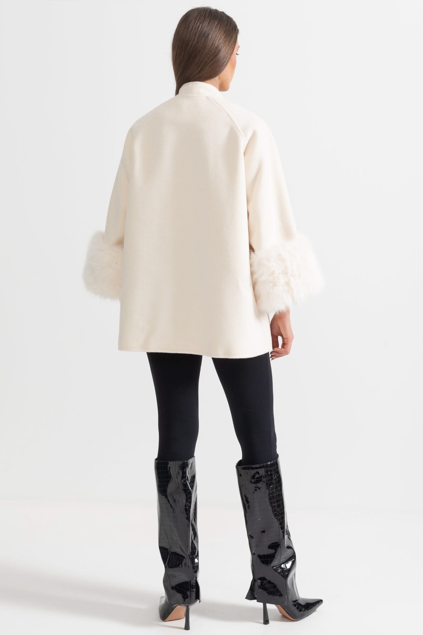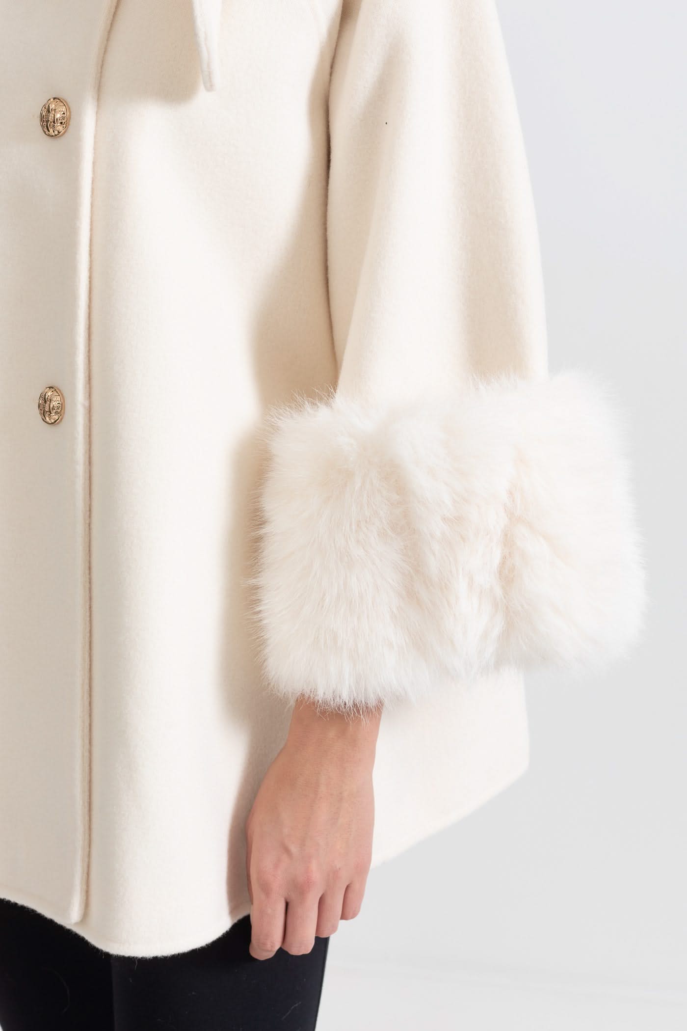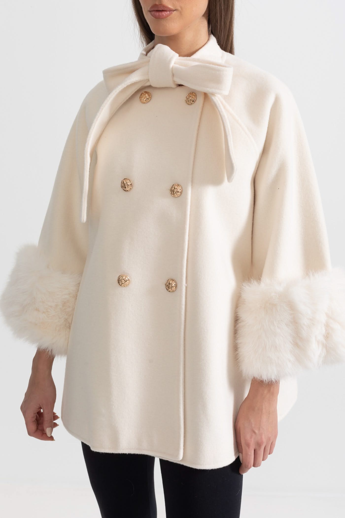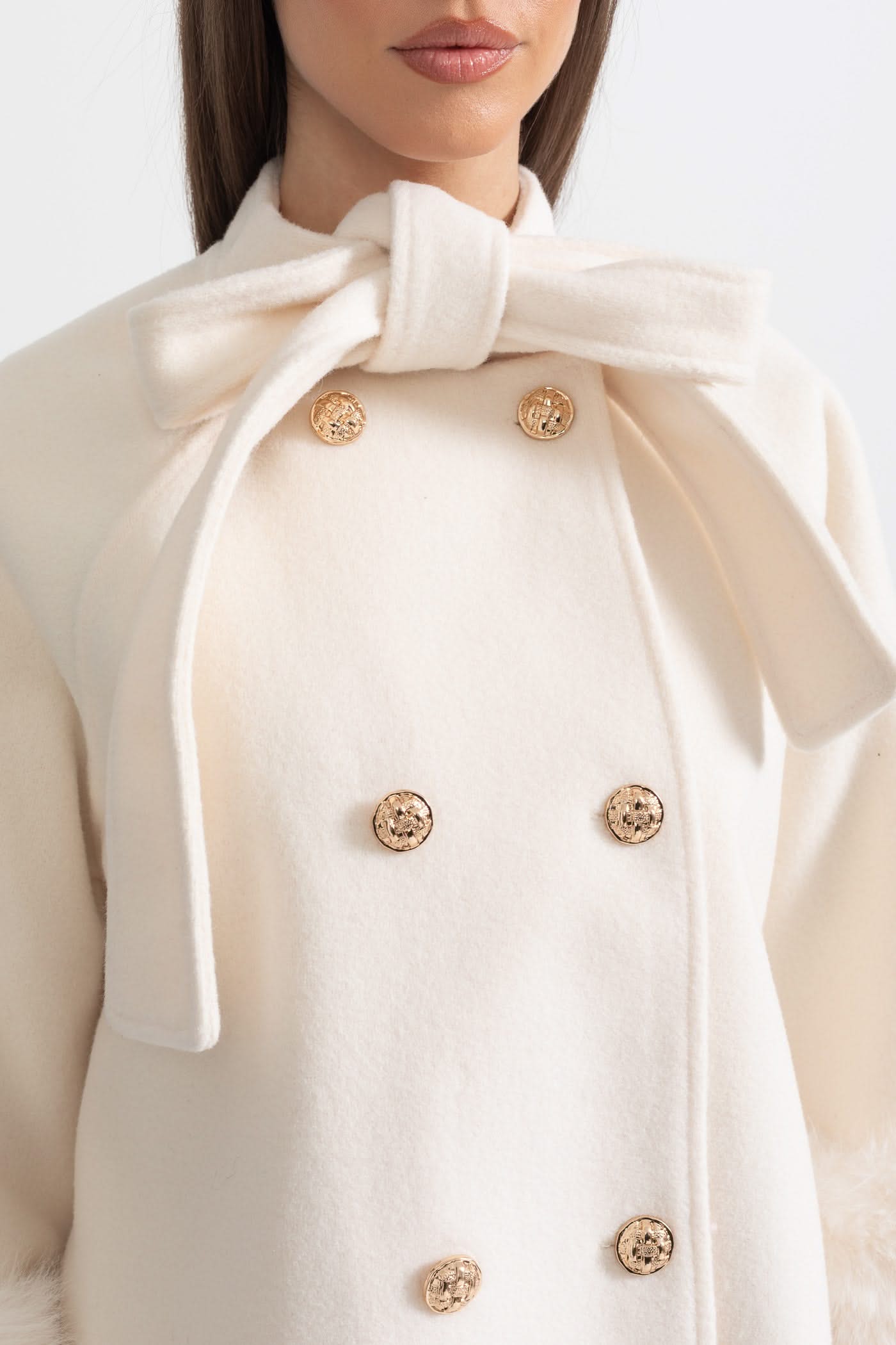 Kürk Manşet Detayları Ve Yaka Kurdelesi Olan Çift Düğmeli Palto - Fildişi