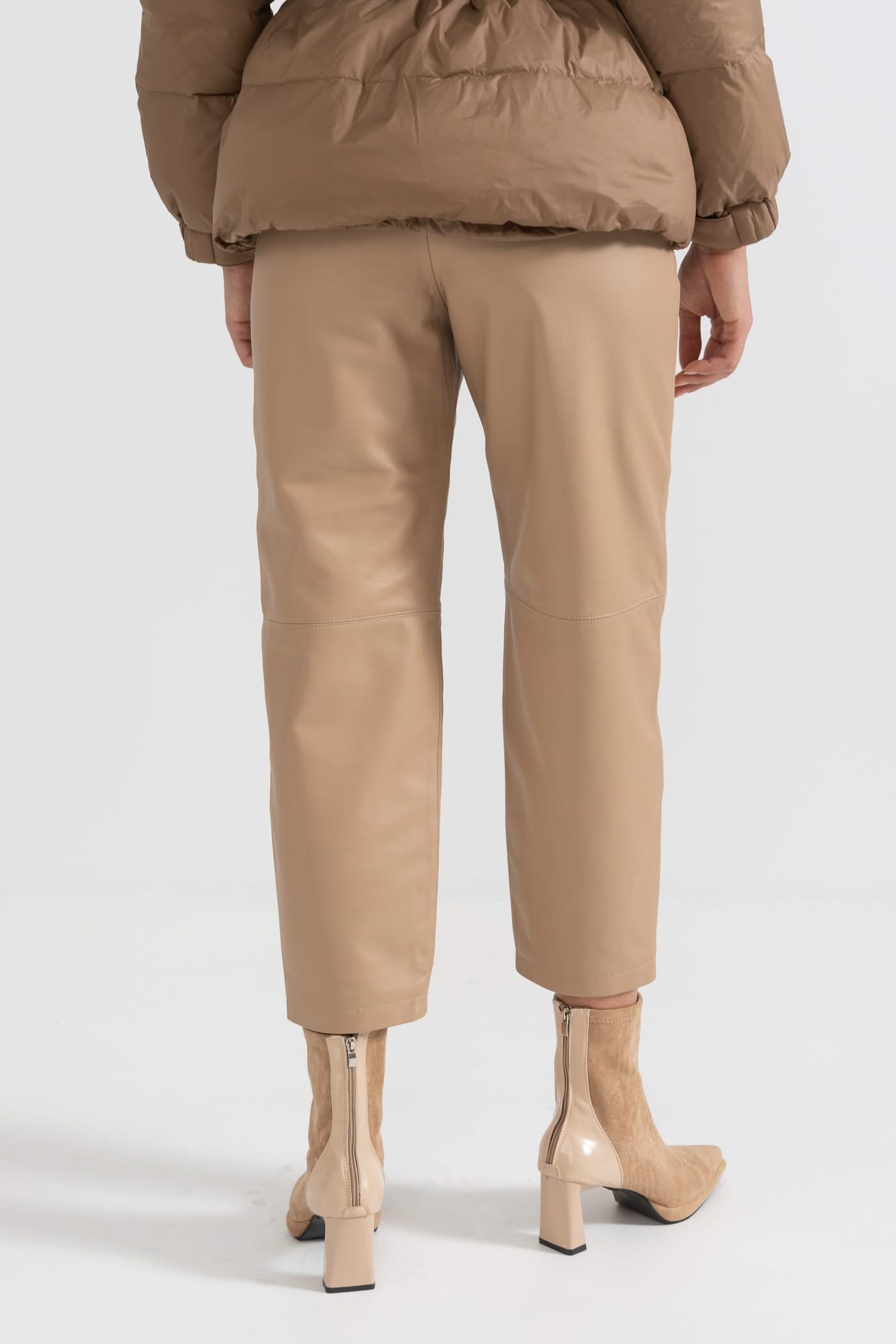 Dekoratif Dikişli Deri Düz Paça Pantolon - Bej