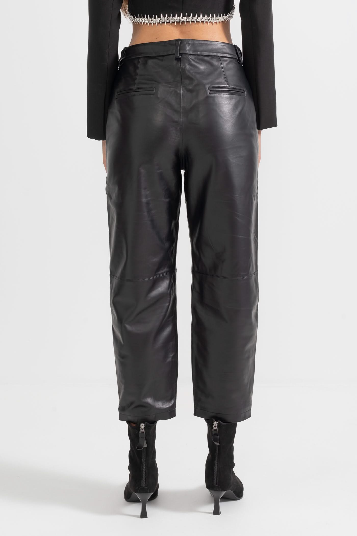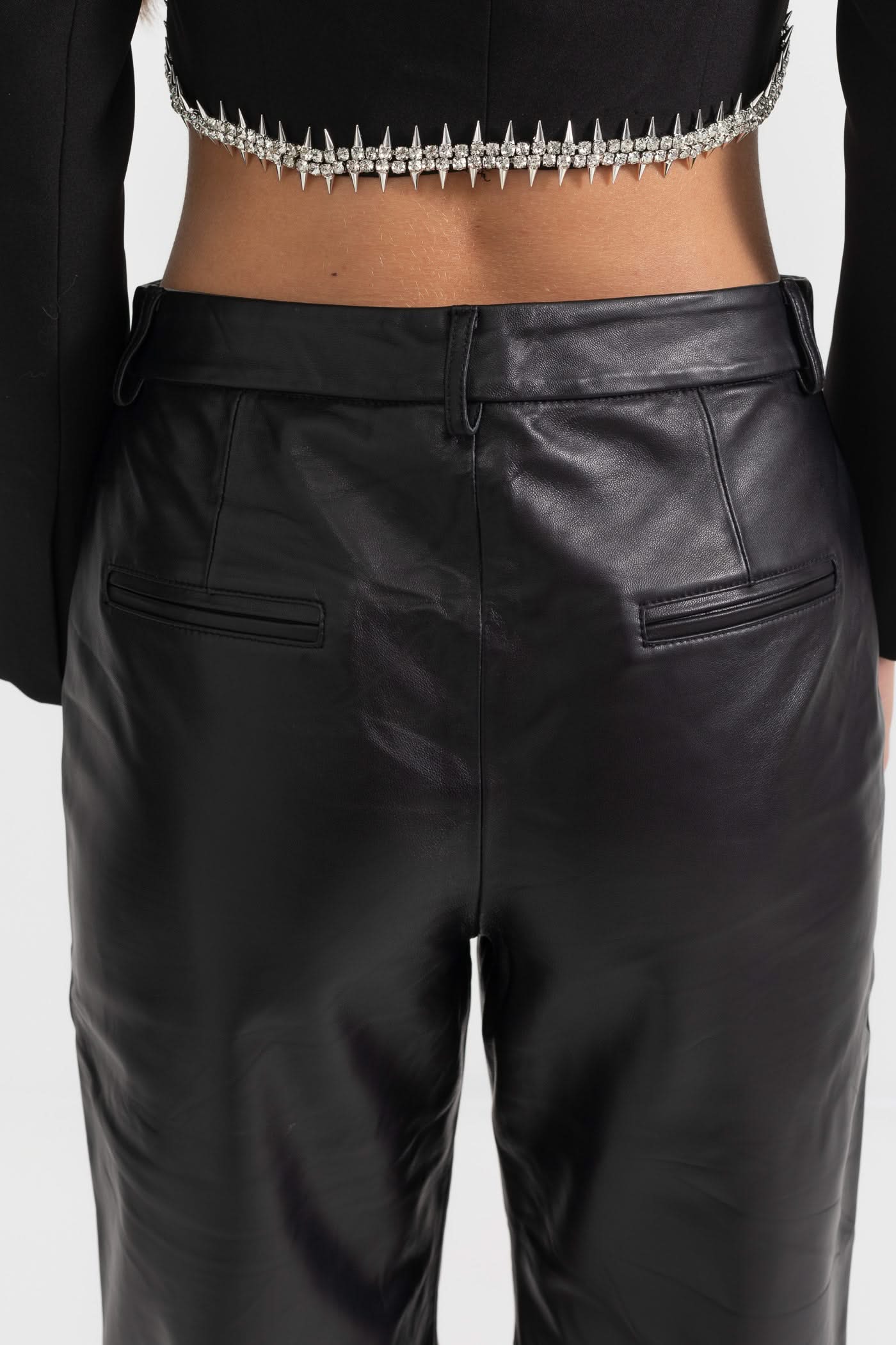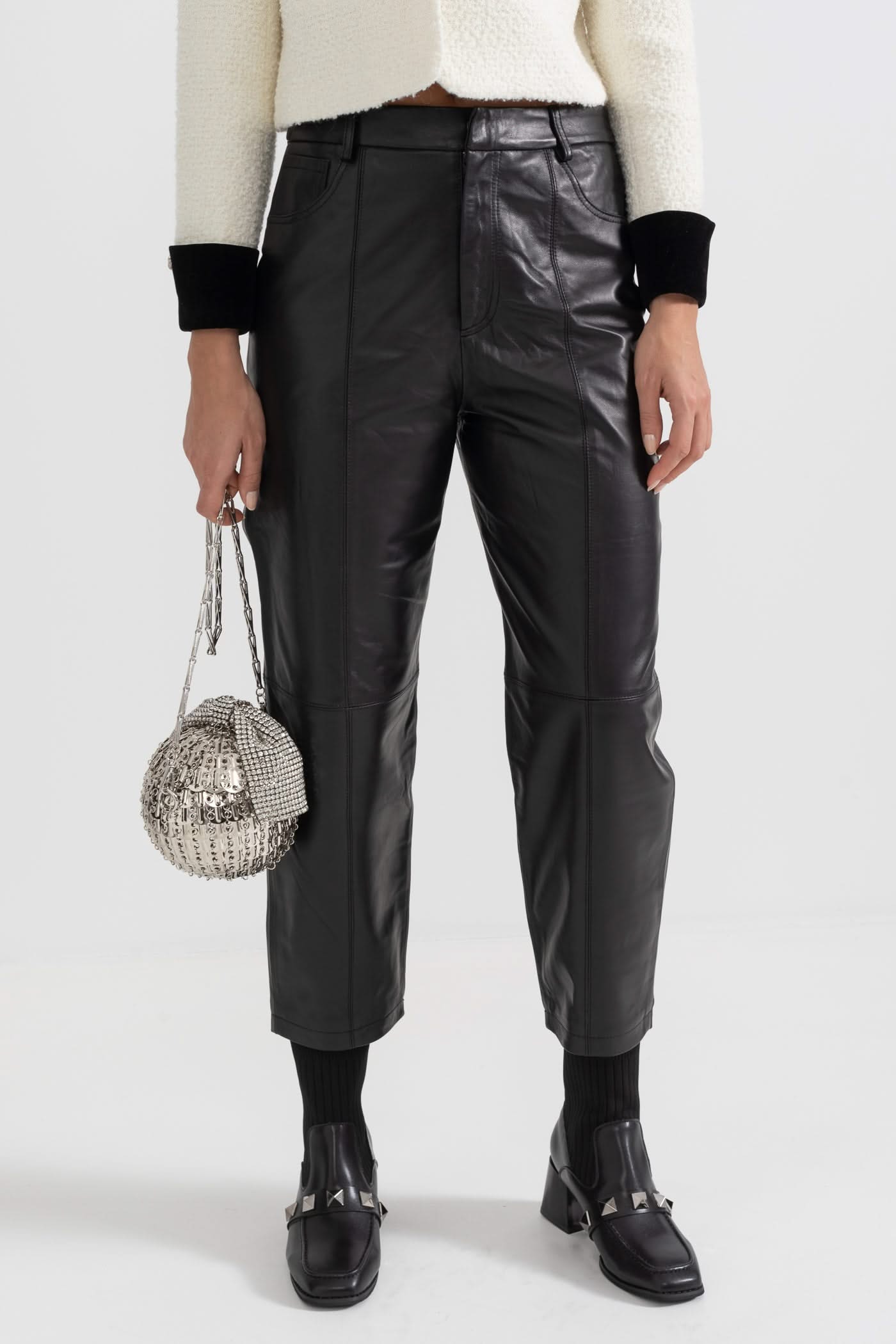 Dekoratif Dikişli Deri Düz Paça Pantolon - Siyah