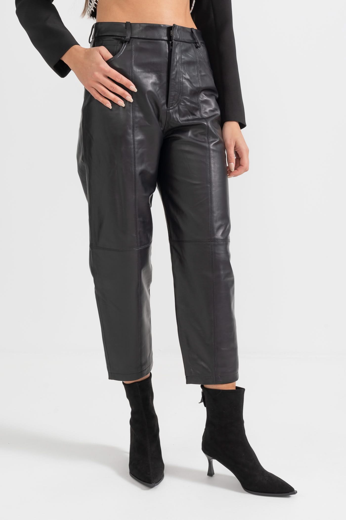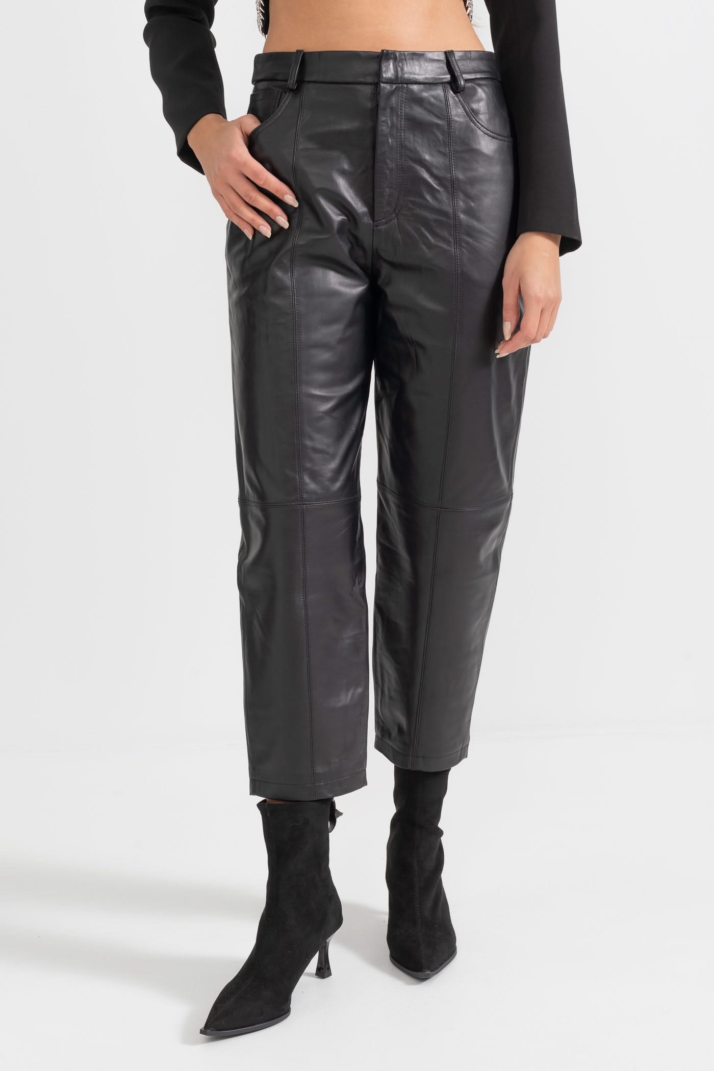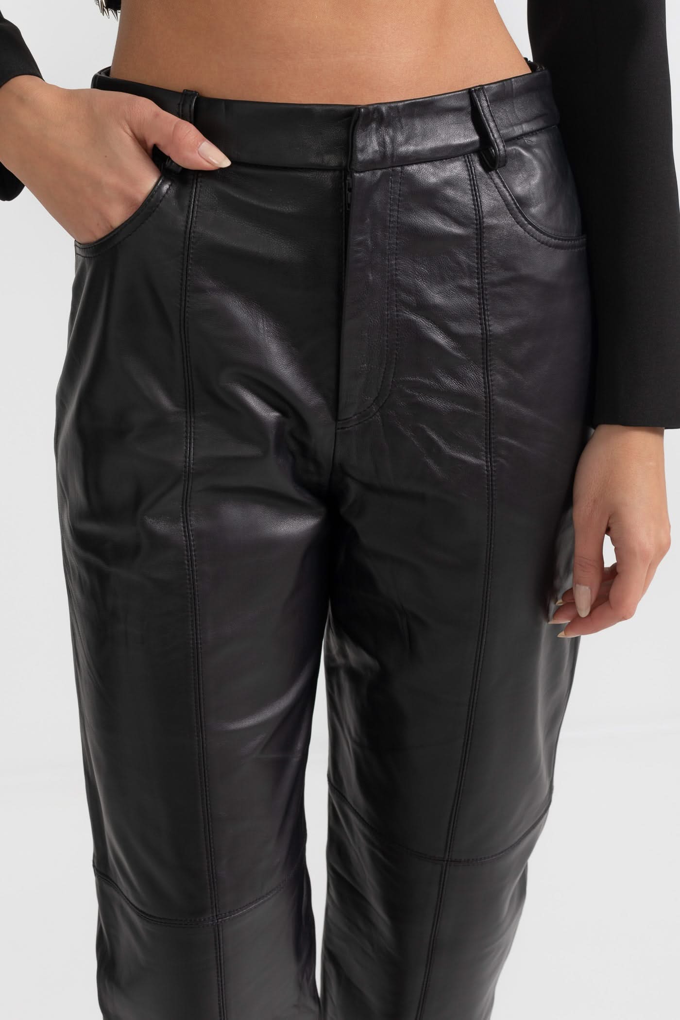 Dekoratif Dikişli Deri Düz Paça Pantolon - Siyah