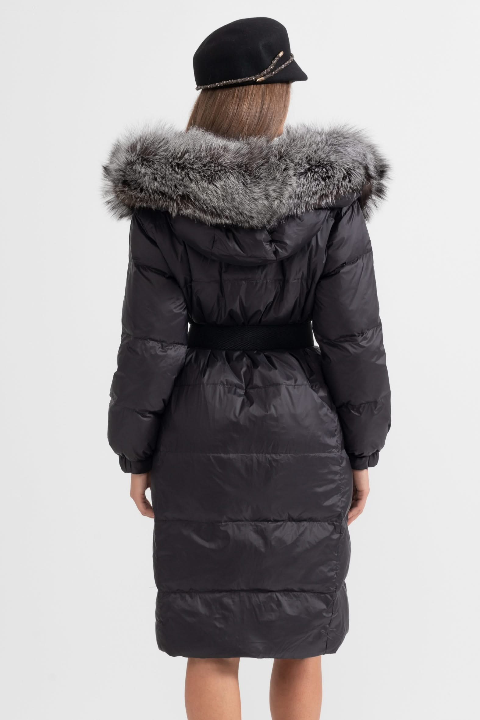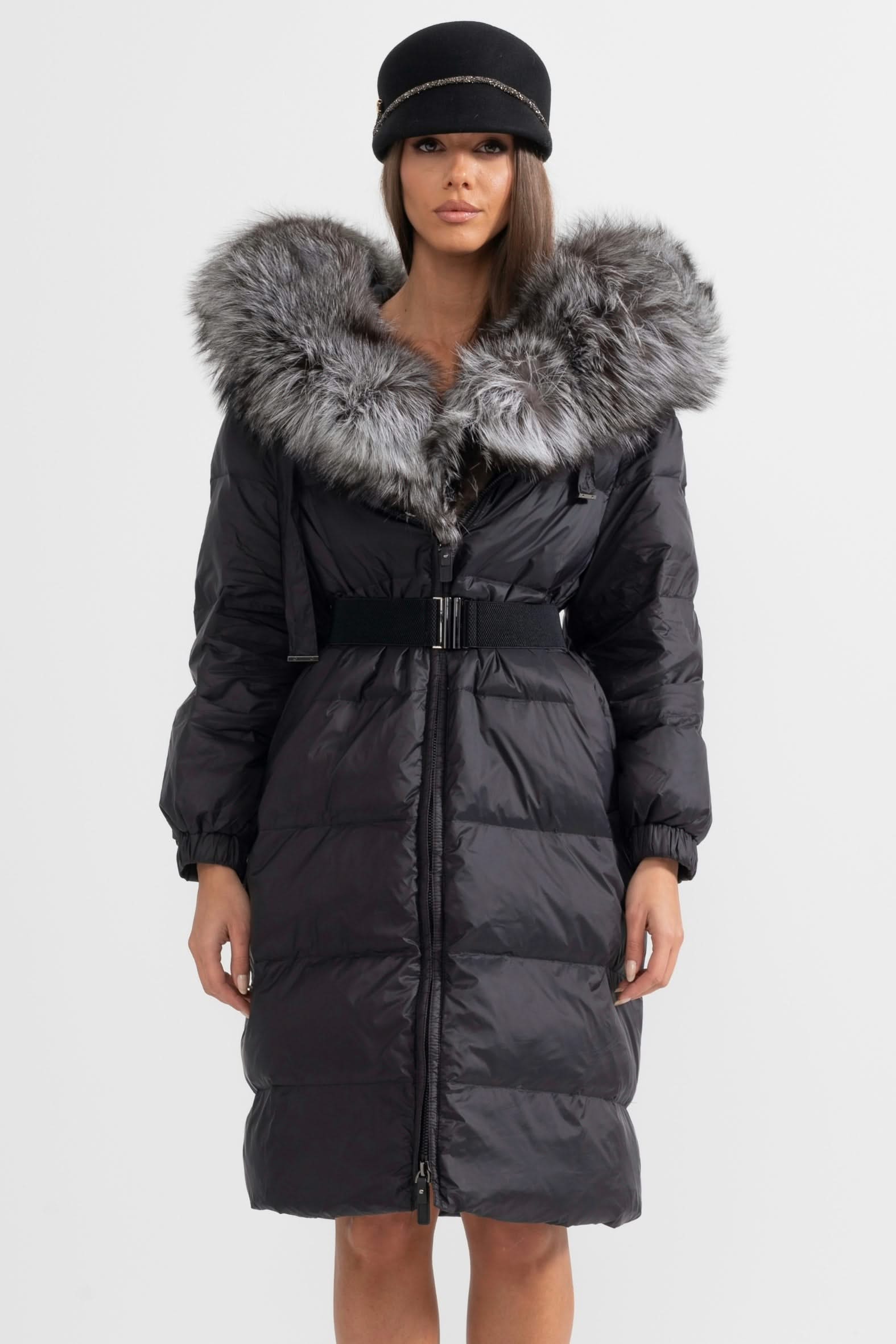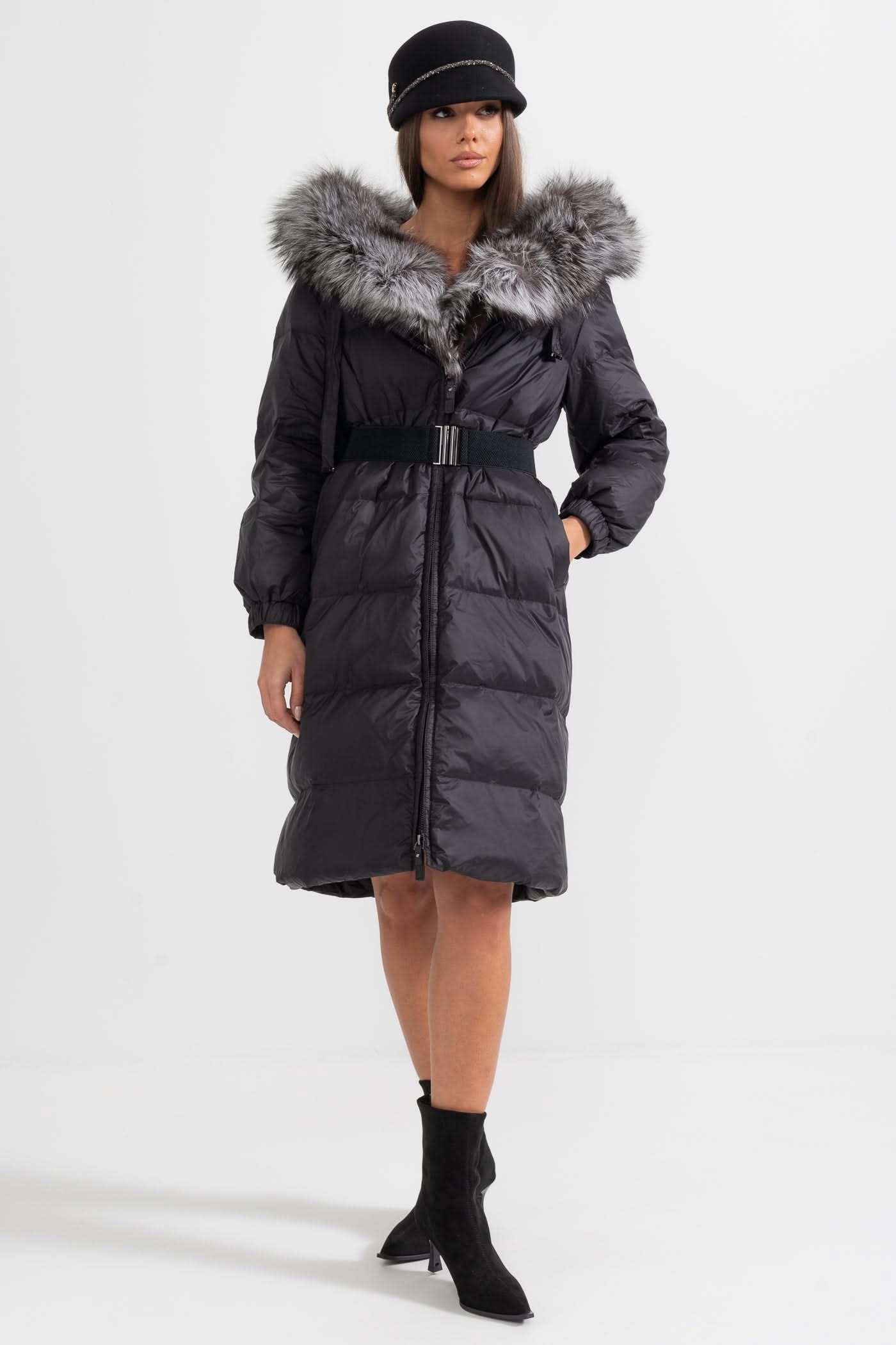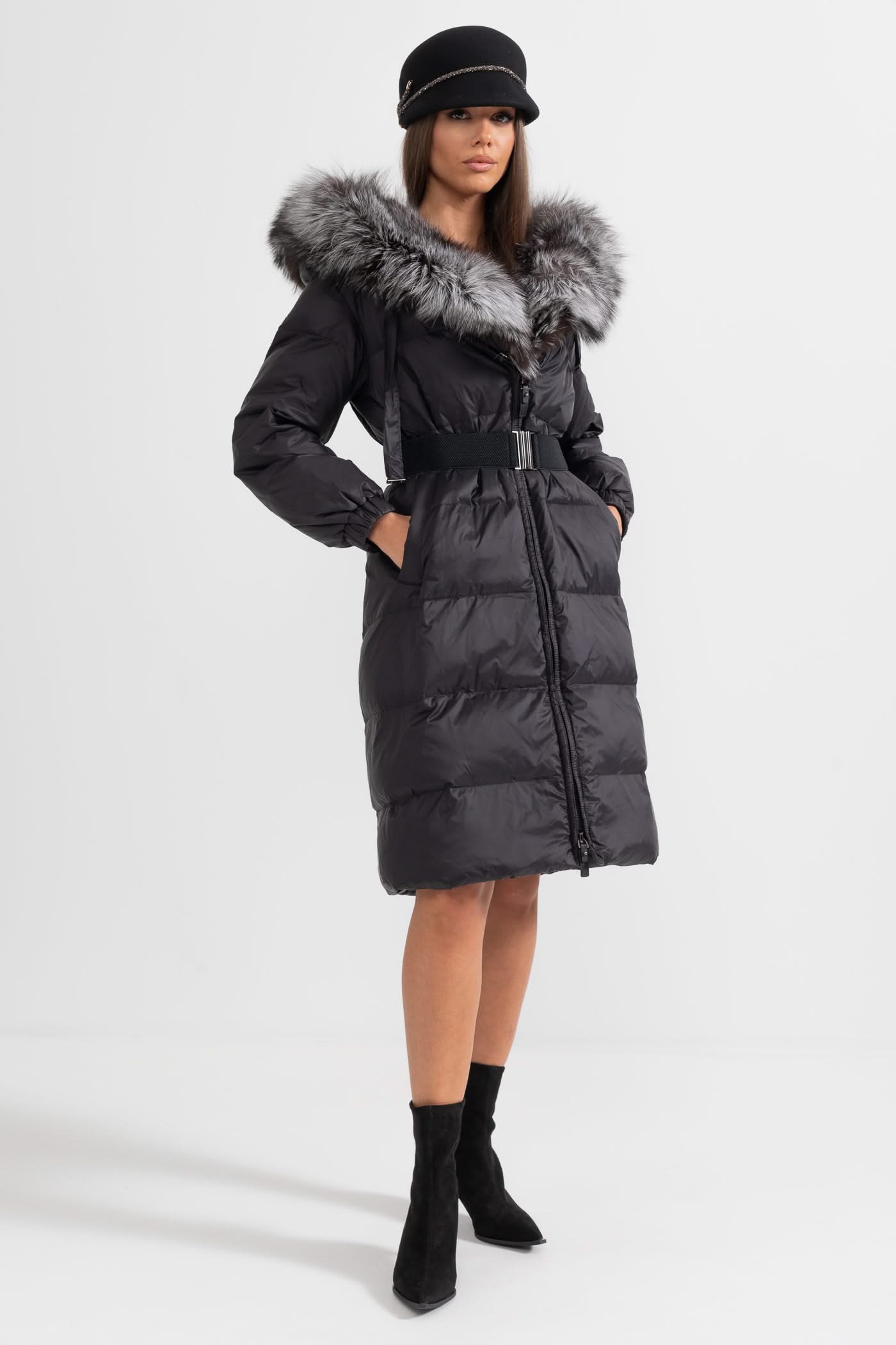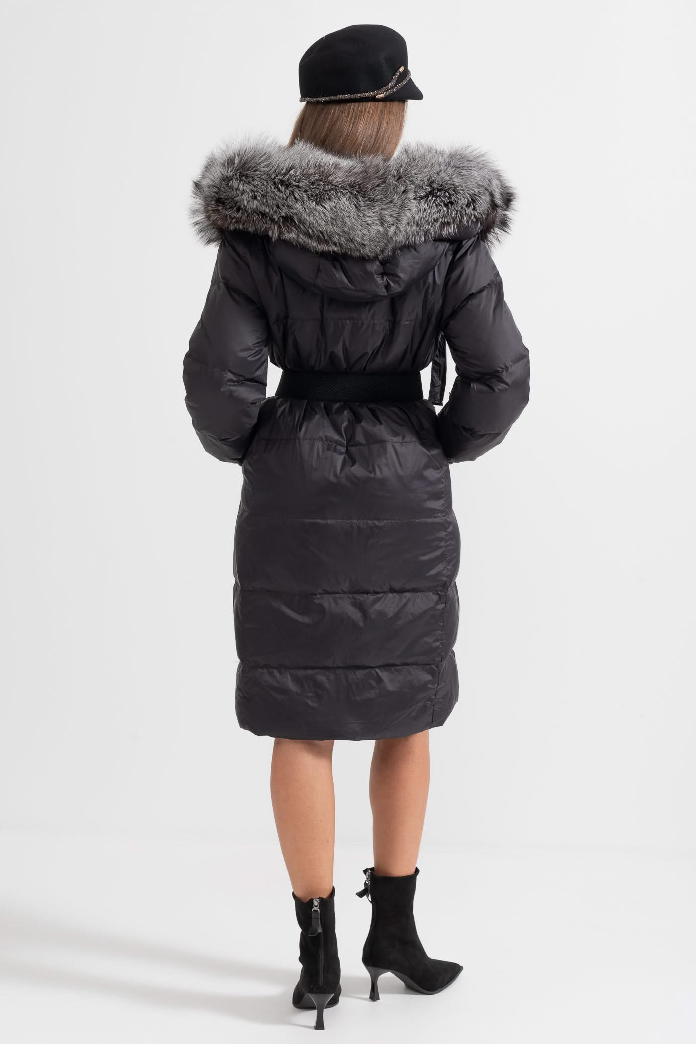 Gri Tilki Kürk Kapüşonlu Uzun Şişme Mont - Siyah