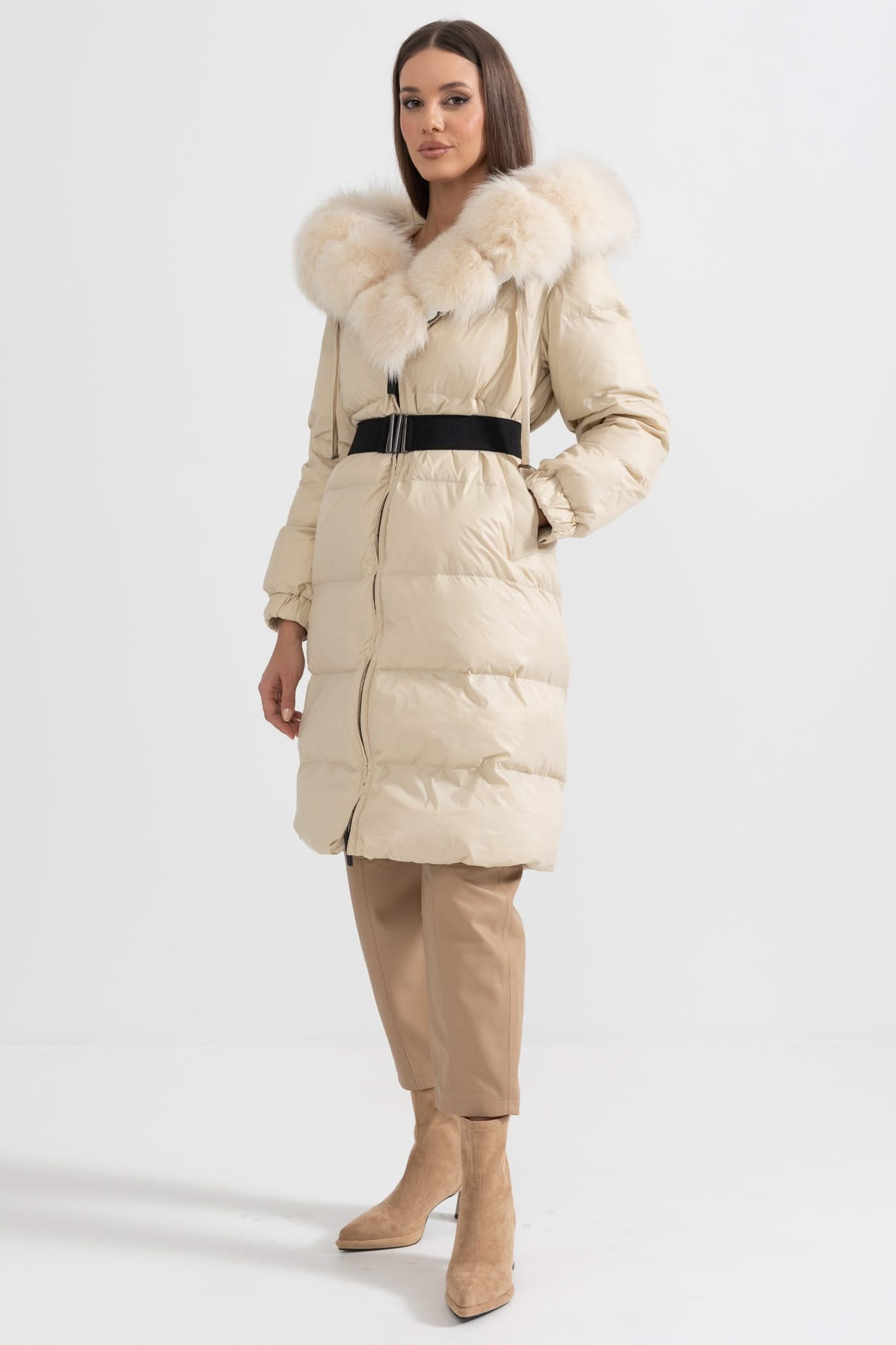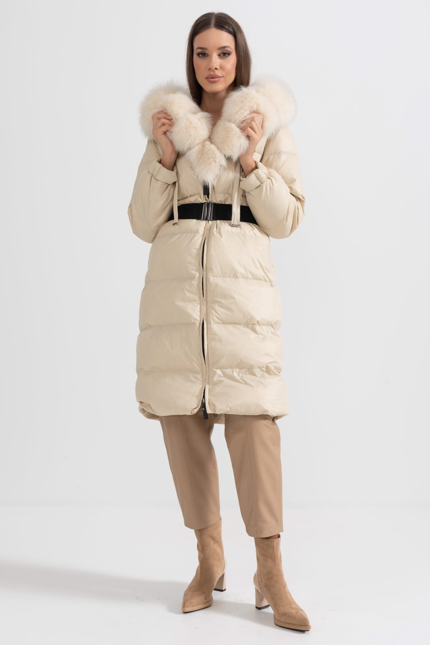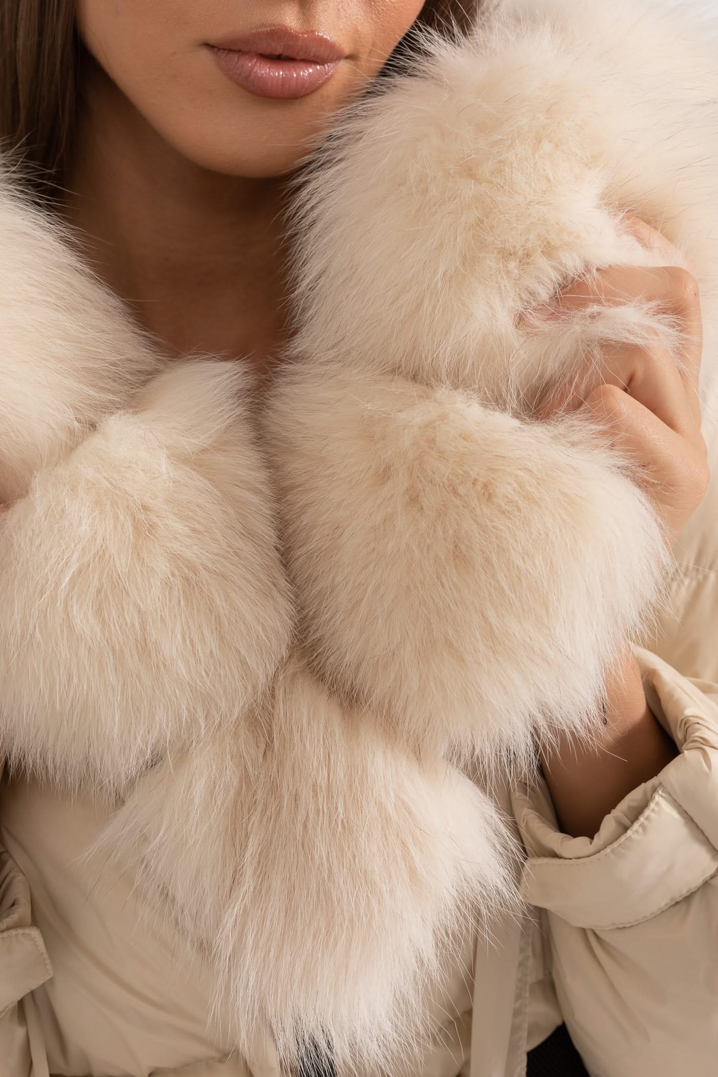 Beyaz Tilki Kürk Kapüşonlu Uzun Şişme Mont - Fildişi