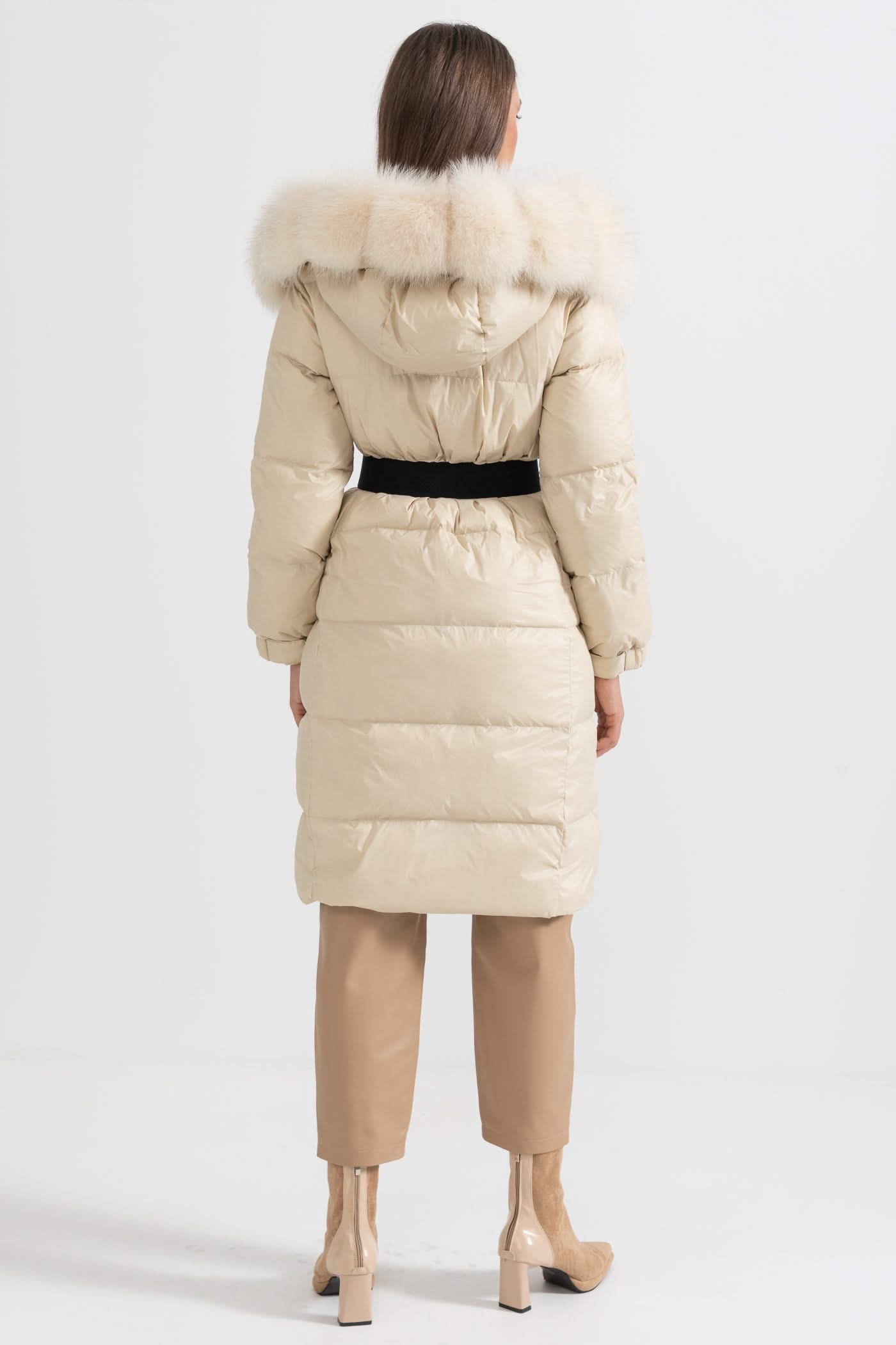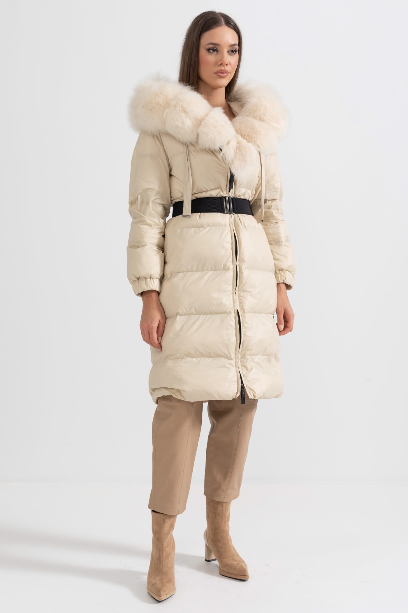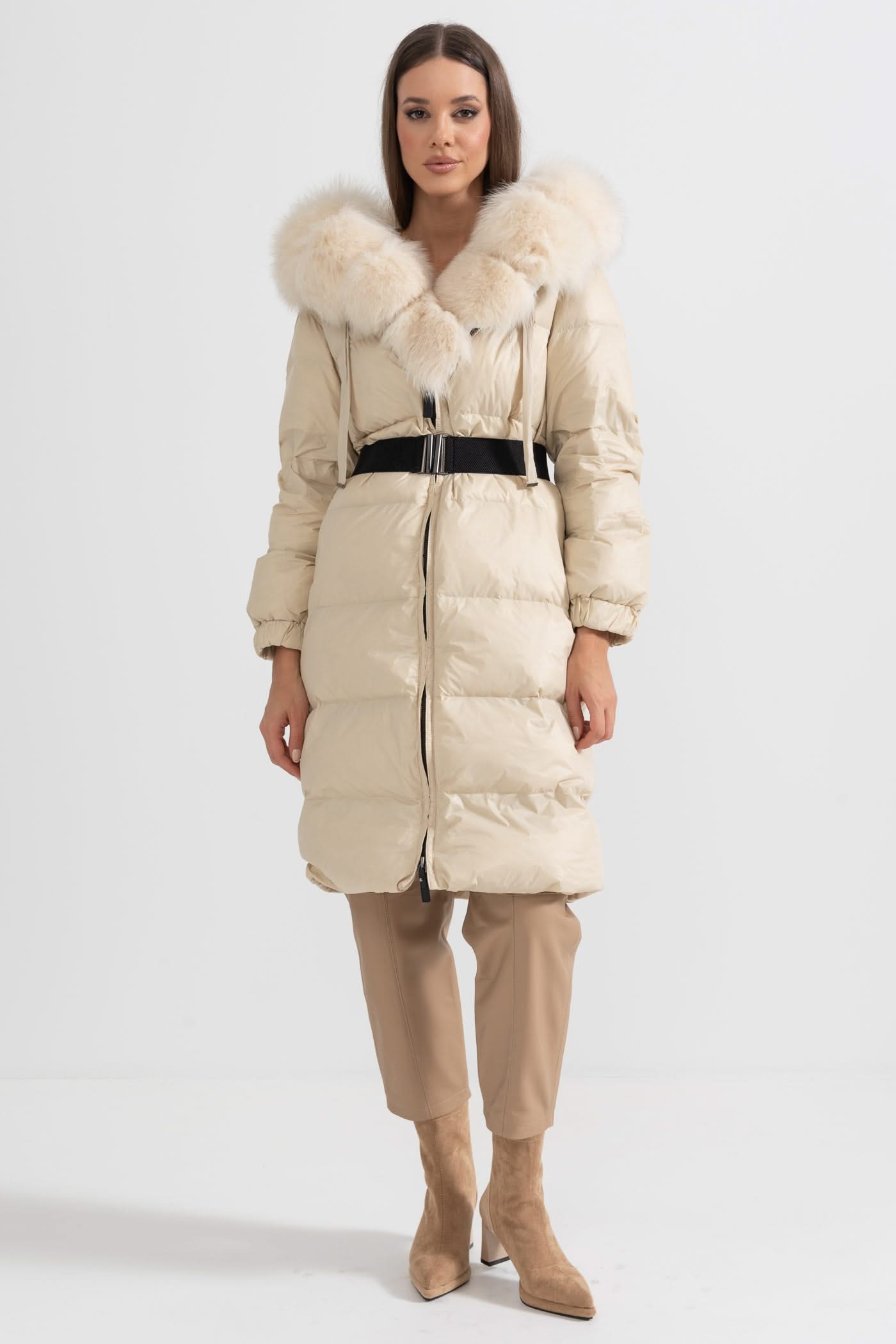 Beyaz Tilki Kürk Kapüşonlu Uzun Şişme Mont - Fildişi