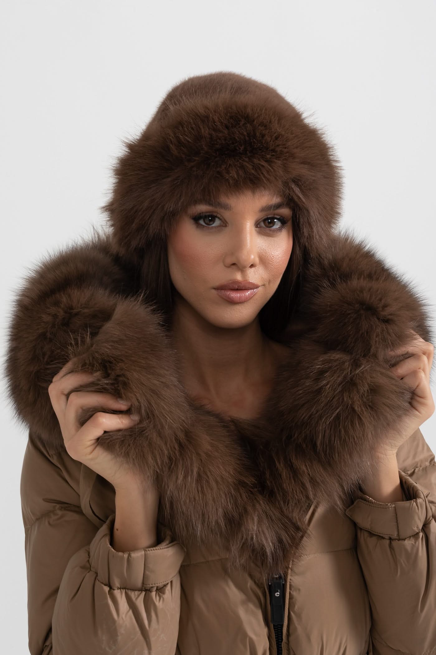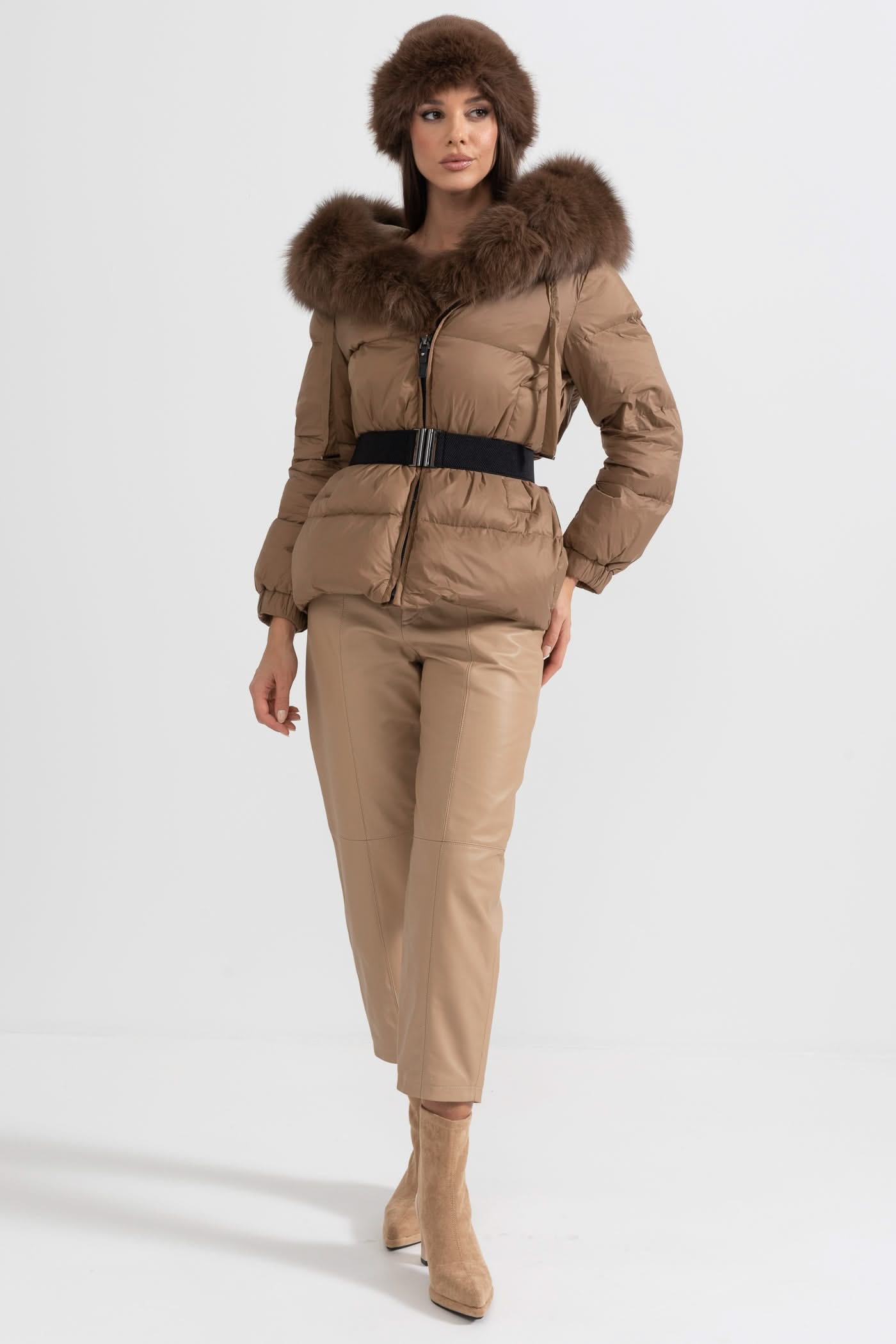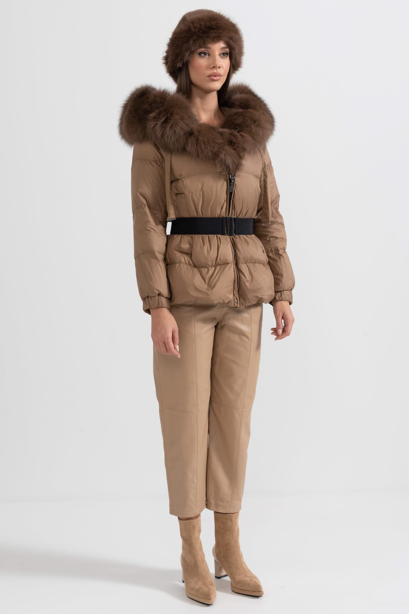 Bel Kemerli Ve Kahverengi Tilki Kürk Kapüşonlu Şişme Mont - Kahverengi