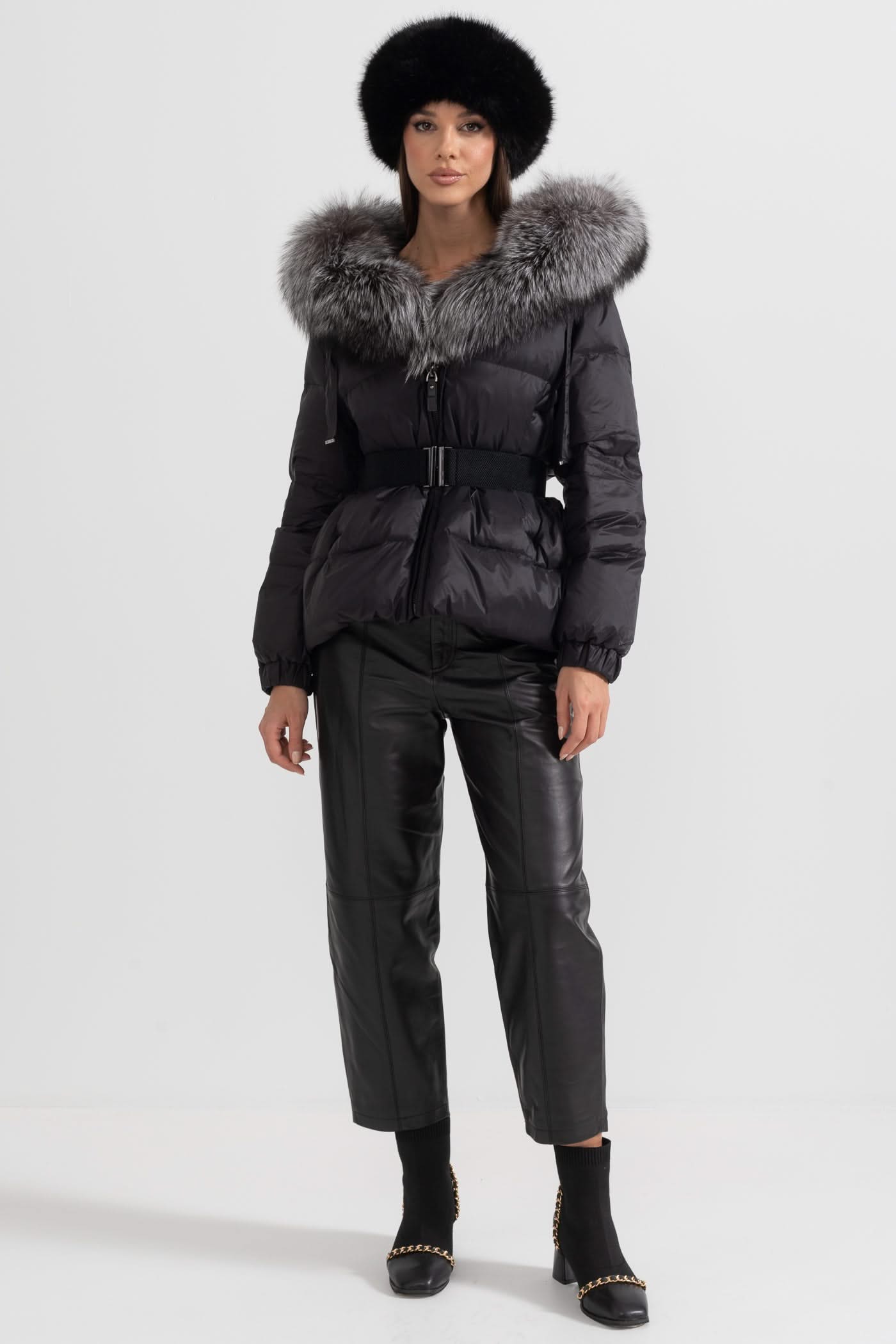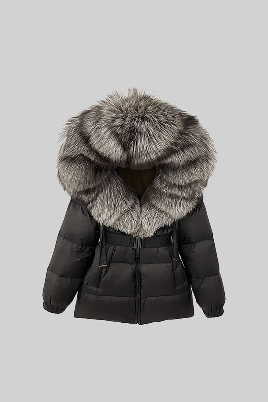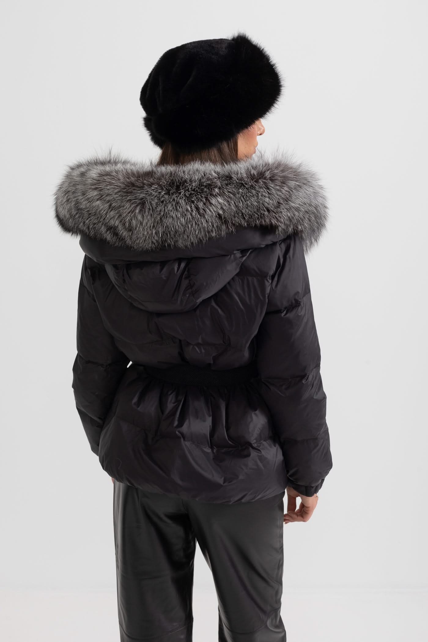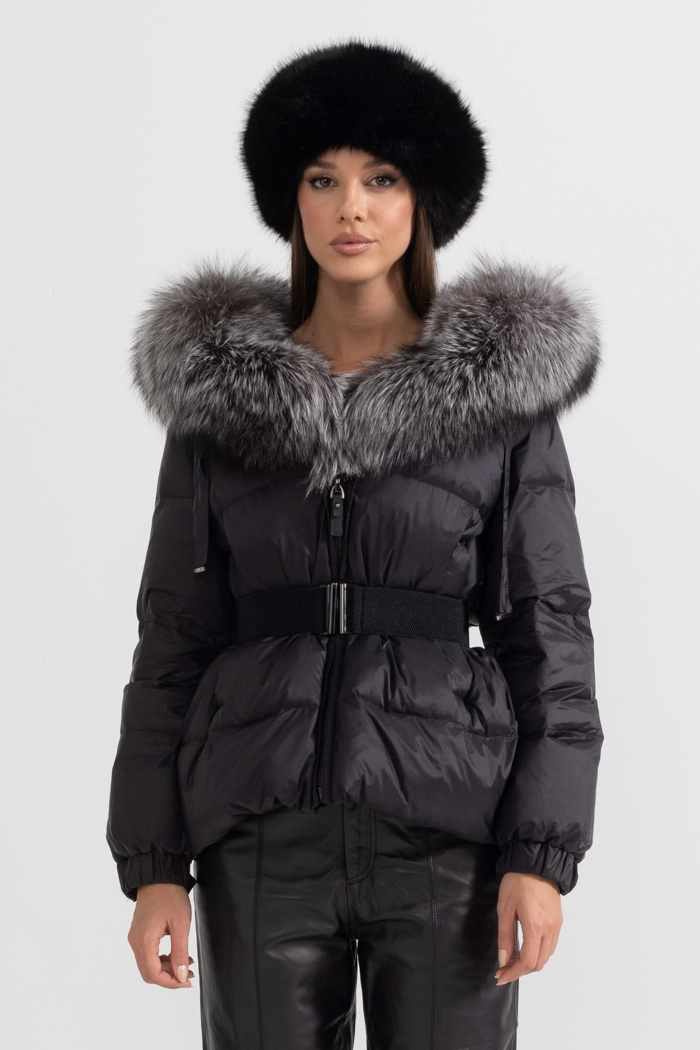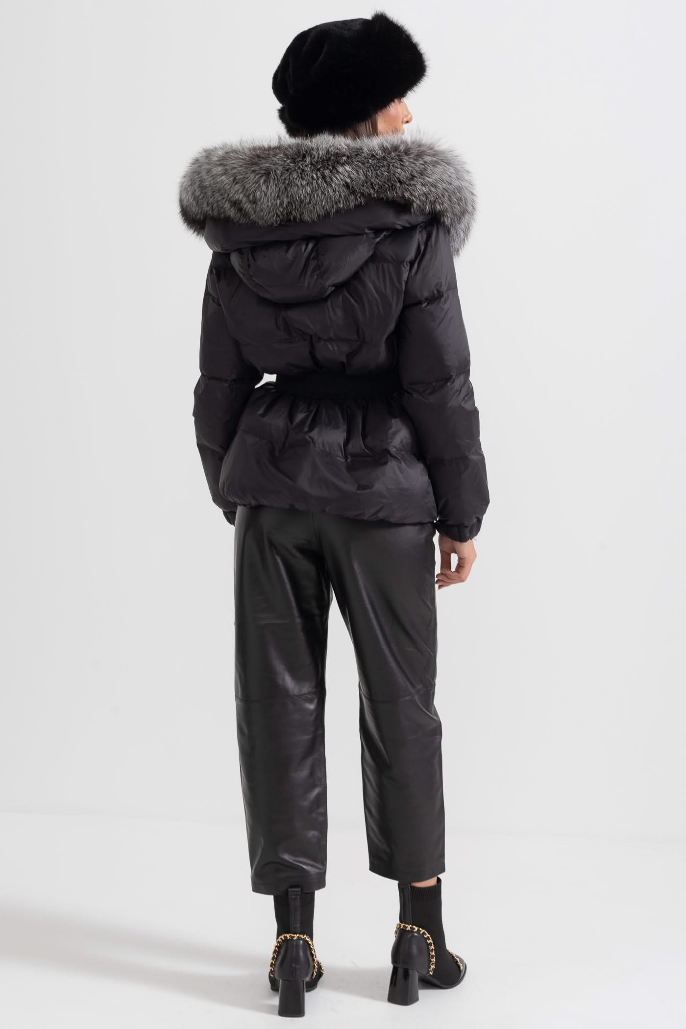 Bel Kemerli Ve Gri Tilki Kürk Kapüşonlu Şişme Mont - Siyah