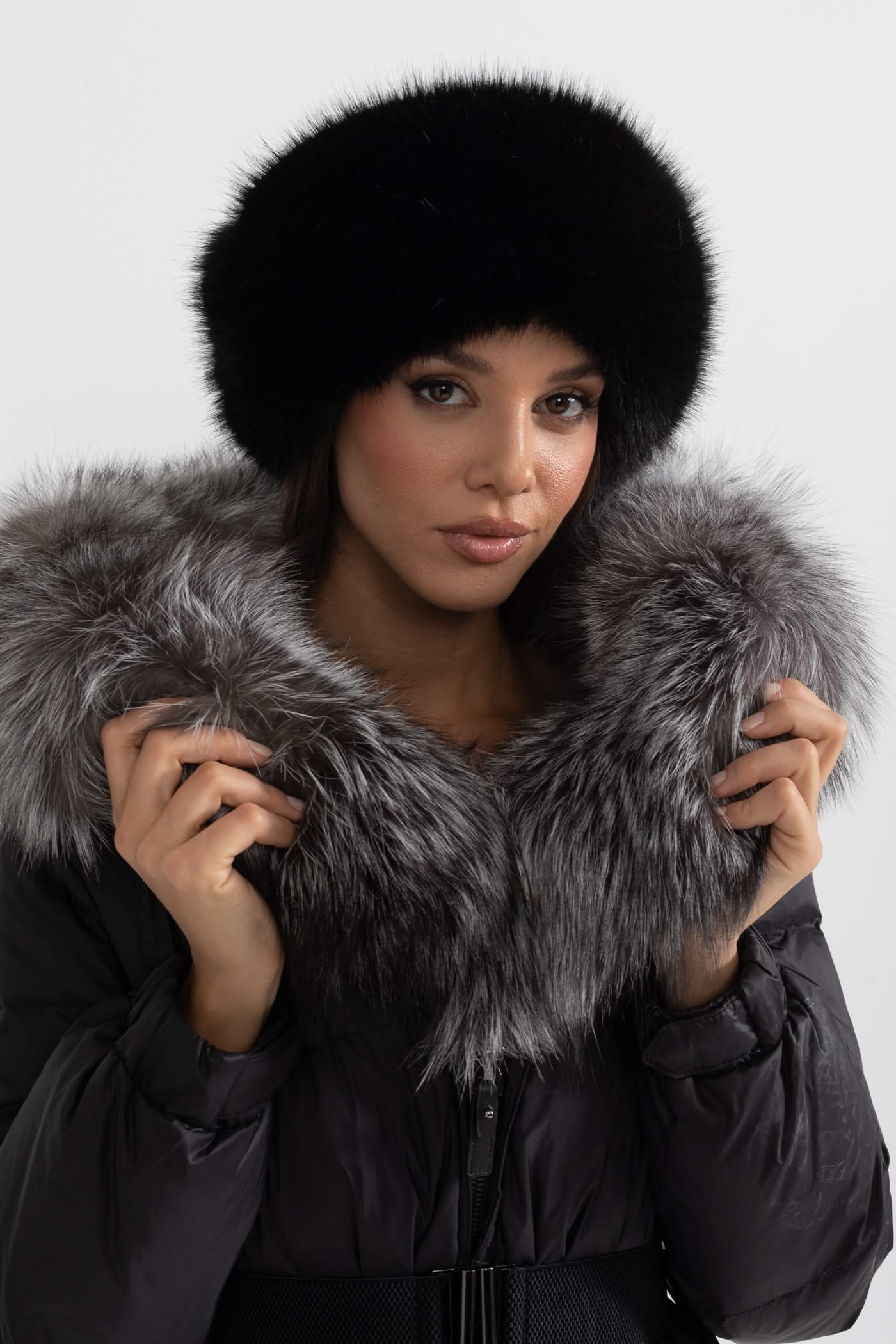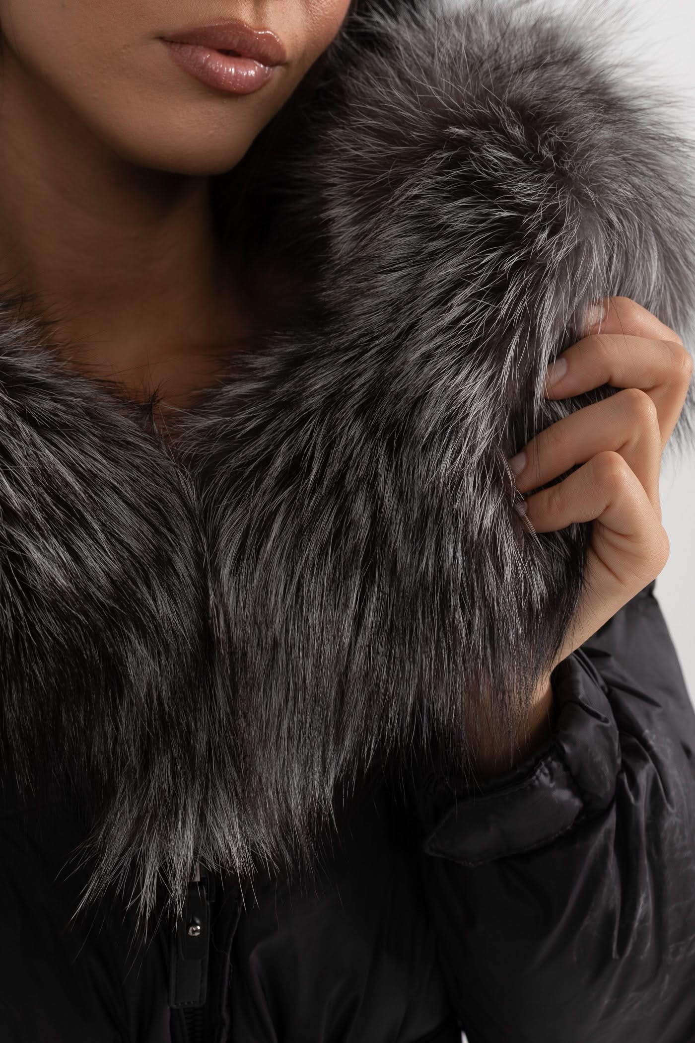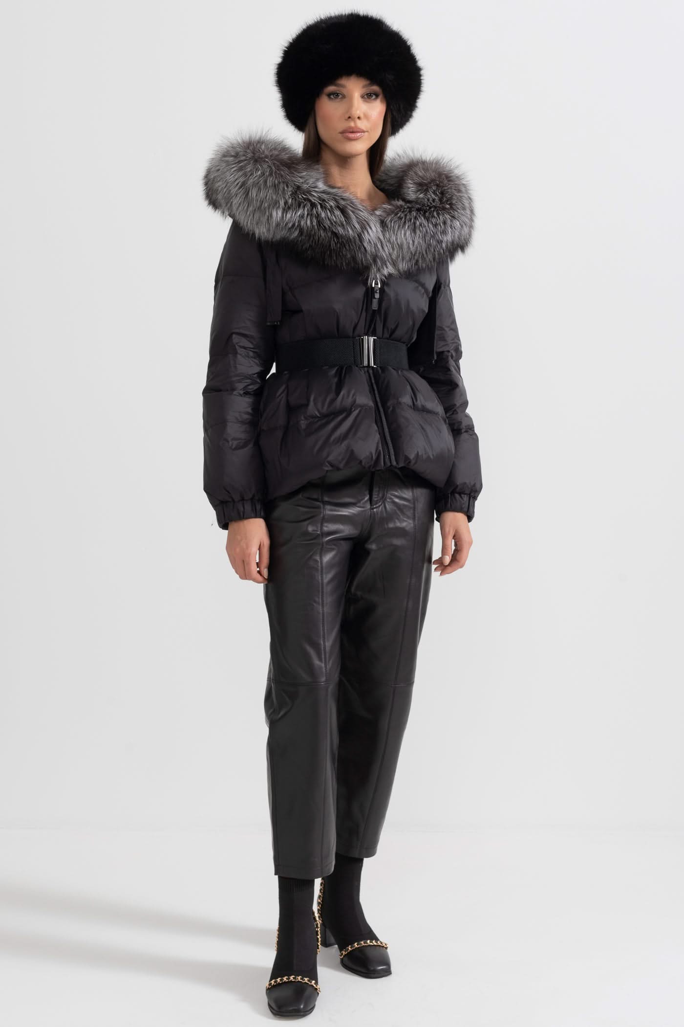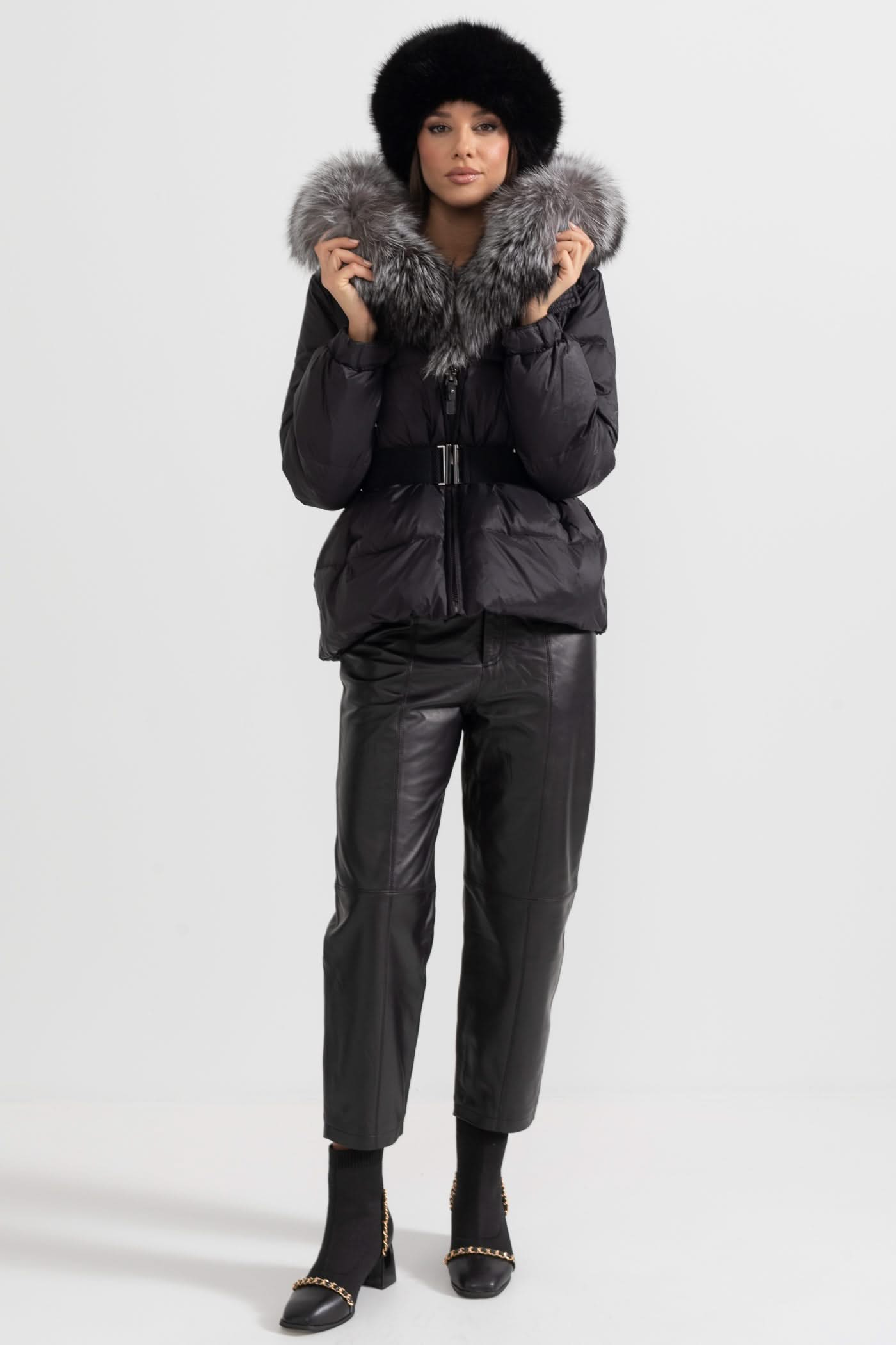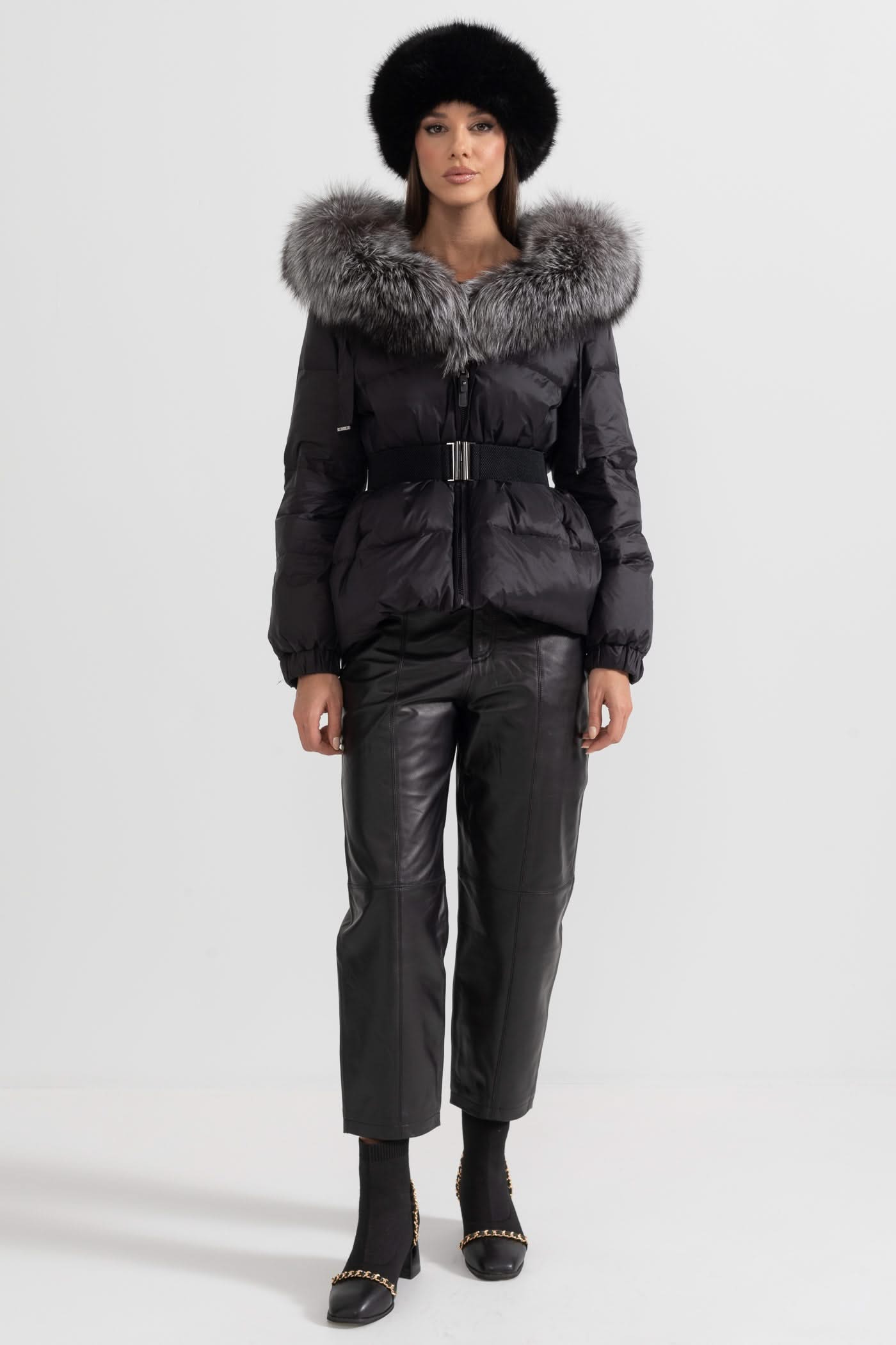 Bel Kemerli Ve Gri Tilki Kürk Kapüşonlu Şişme Mont - Siyah