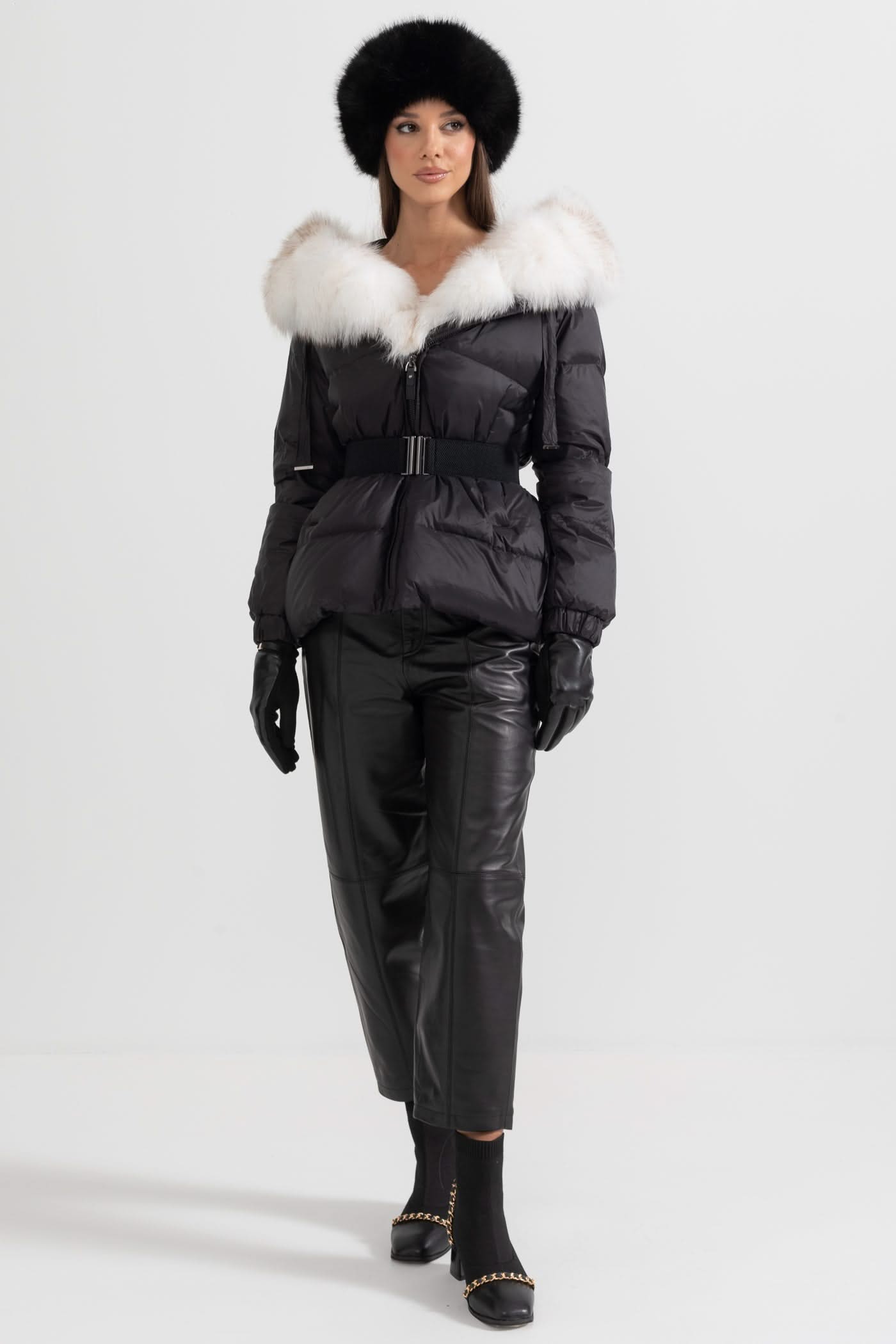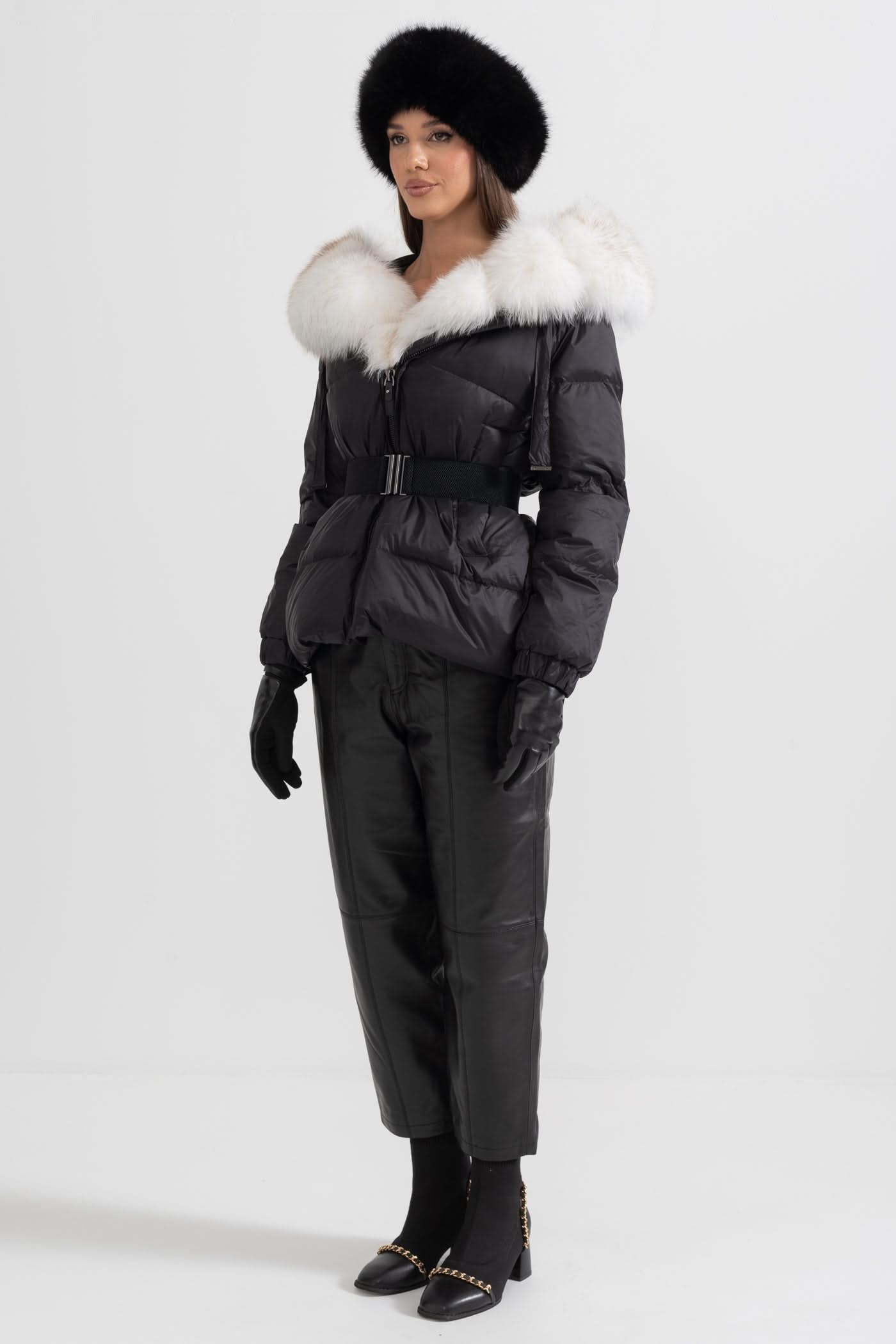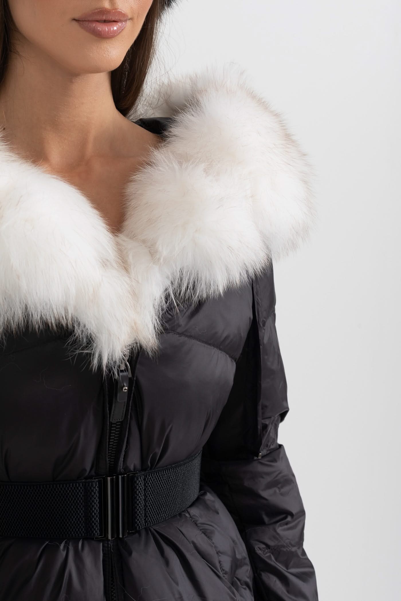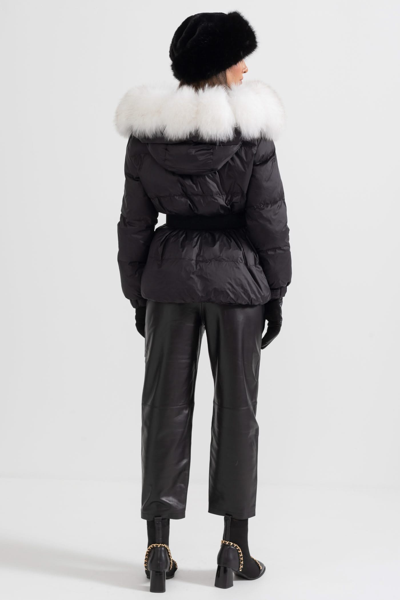 Bel Kemerli Ve Beyaz Tilki Kürk Kapüşonlu Şişme Mont - Siyah