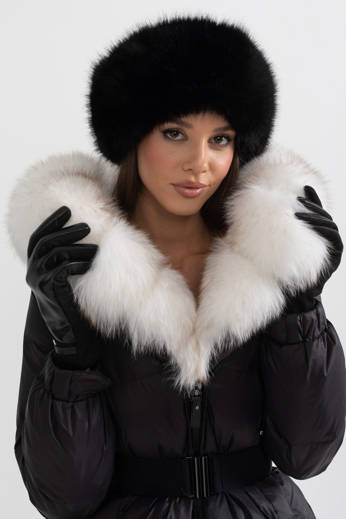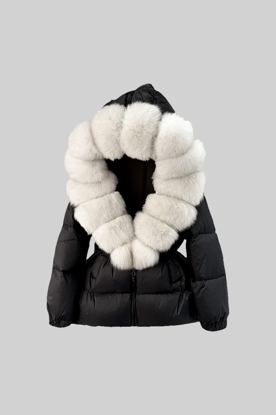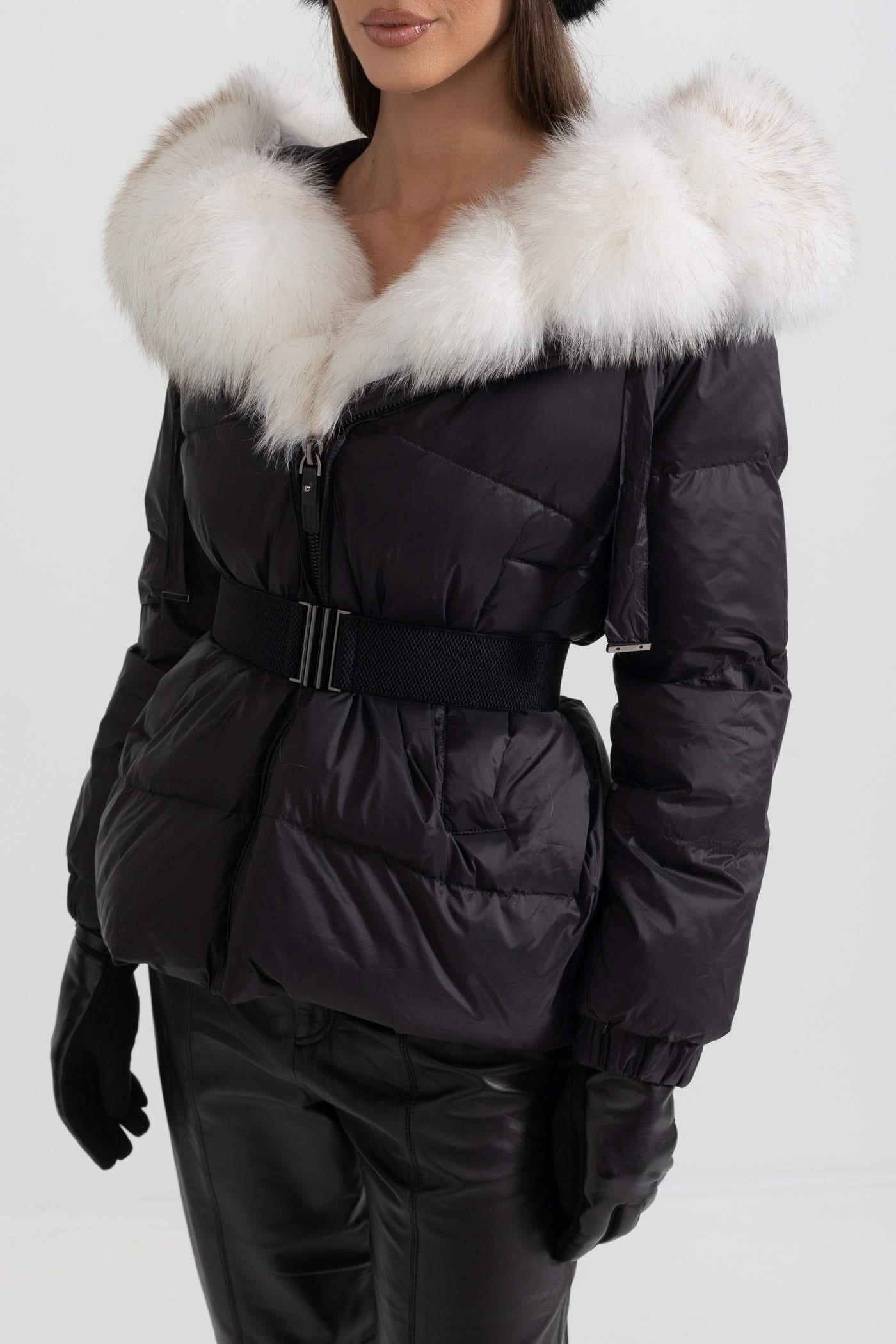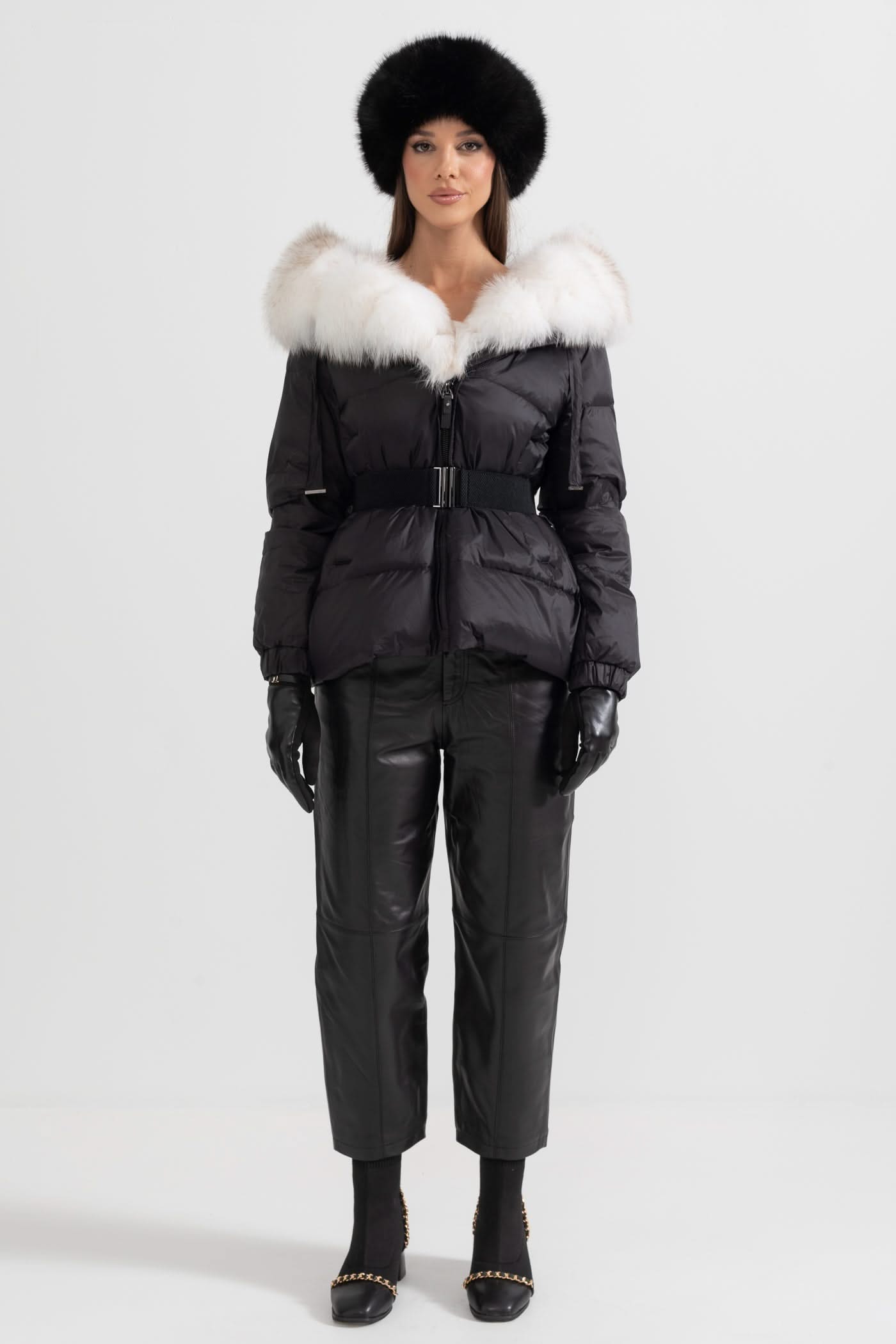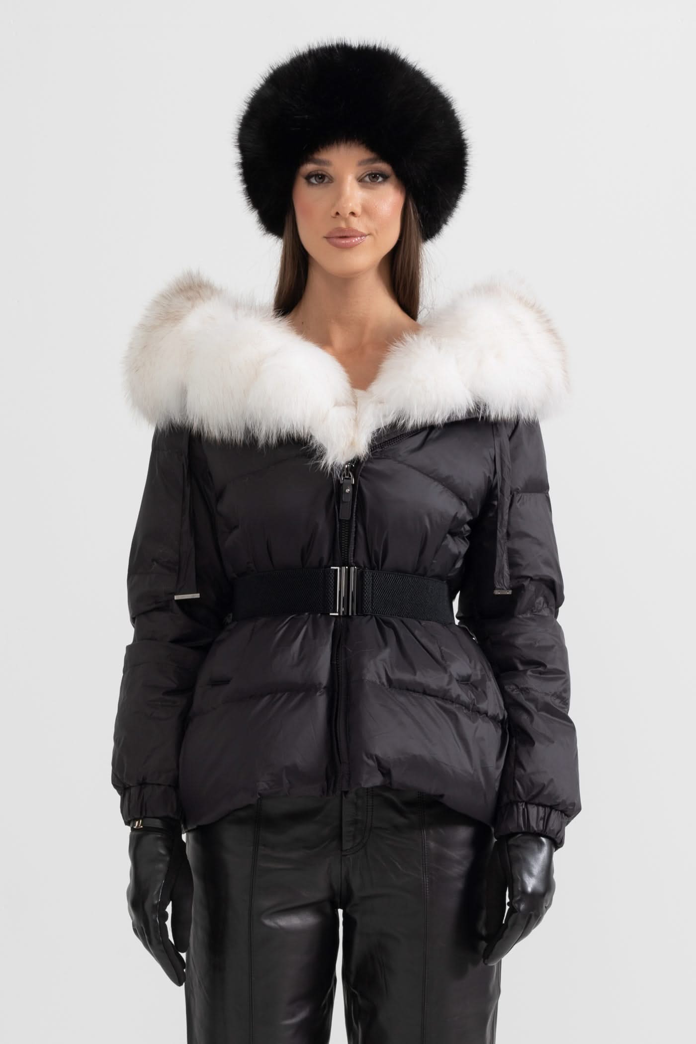 Bel Kemerli Ve Beyaz Tilki Kürk Kapüşonlu Şişme Mont - Siyah