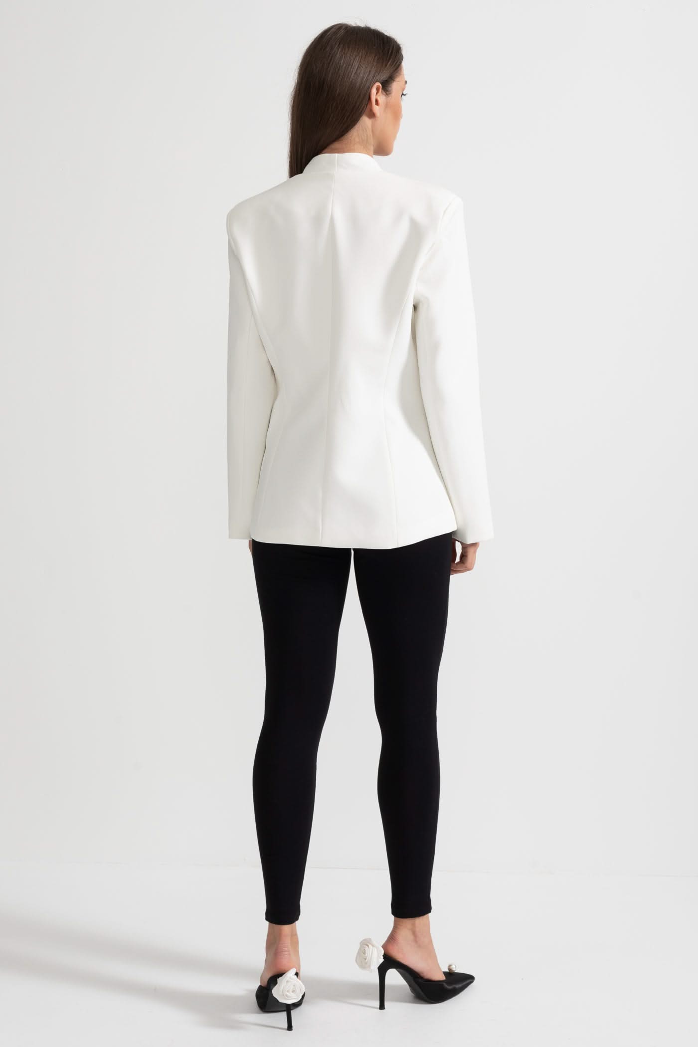 Yapılandırılmış Omuzlar Ve Gümüş Çiçekli Tokalara Sahip Özel Tasarım Blazer - Beyaz