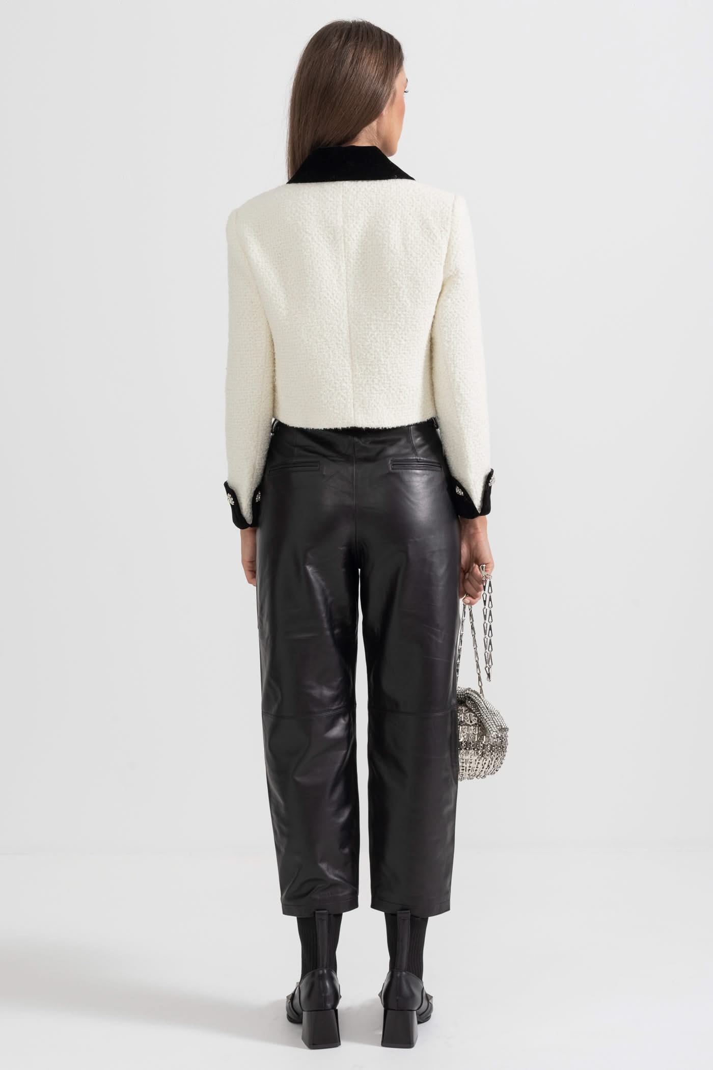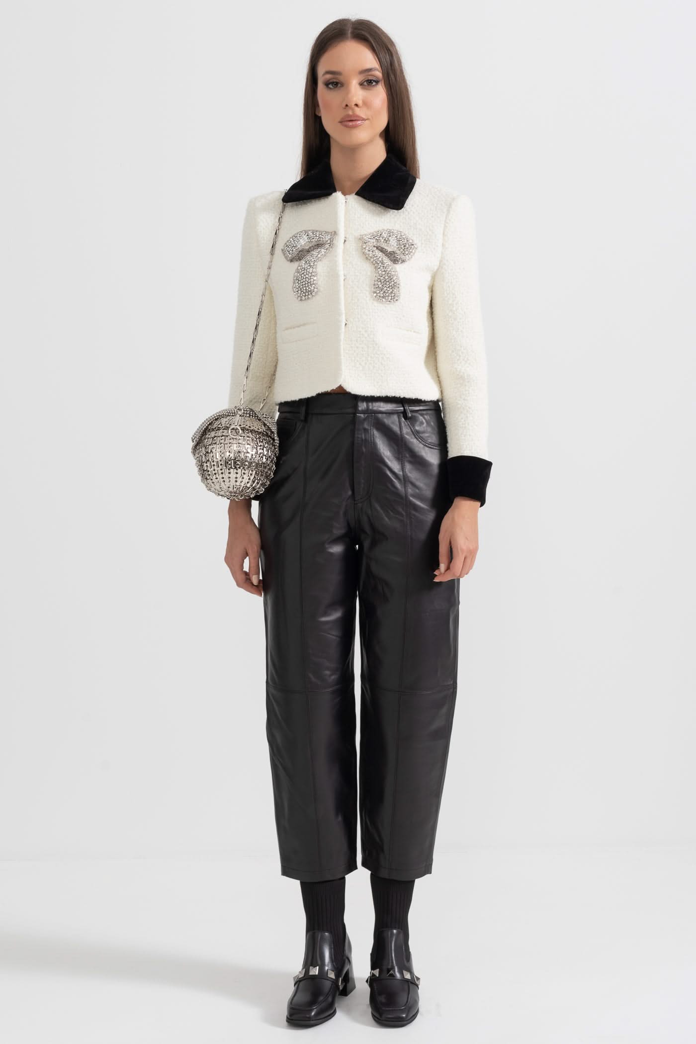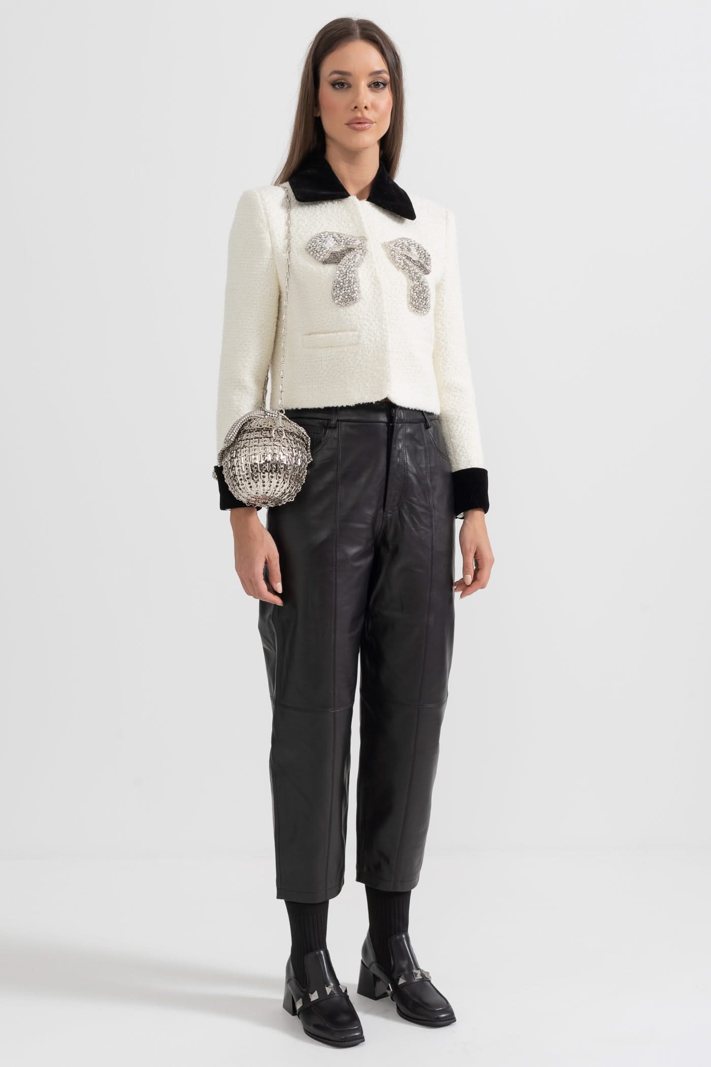 Zıt Renkli Elemanlar Ve Metalik Fiyonk Detaylarıyla Tweed Blazer - Beyaz
