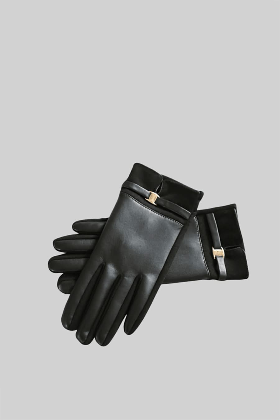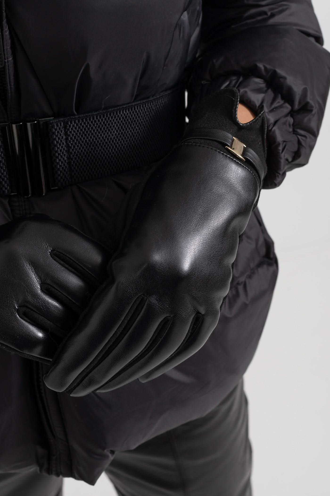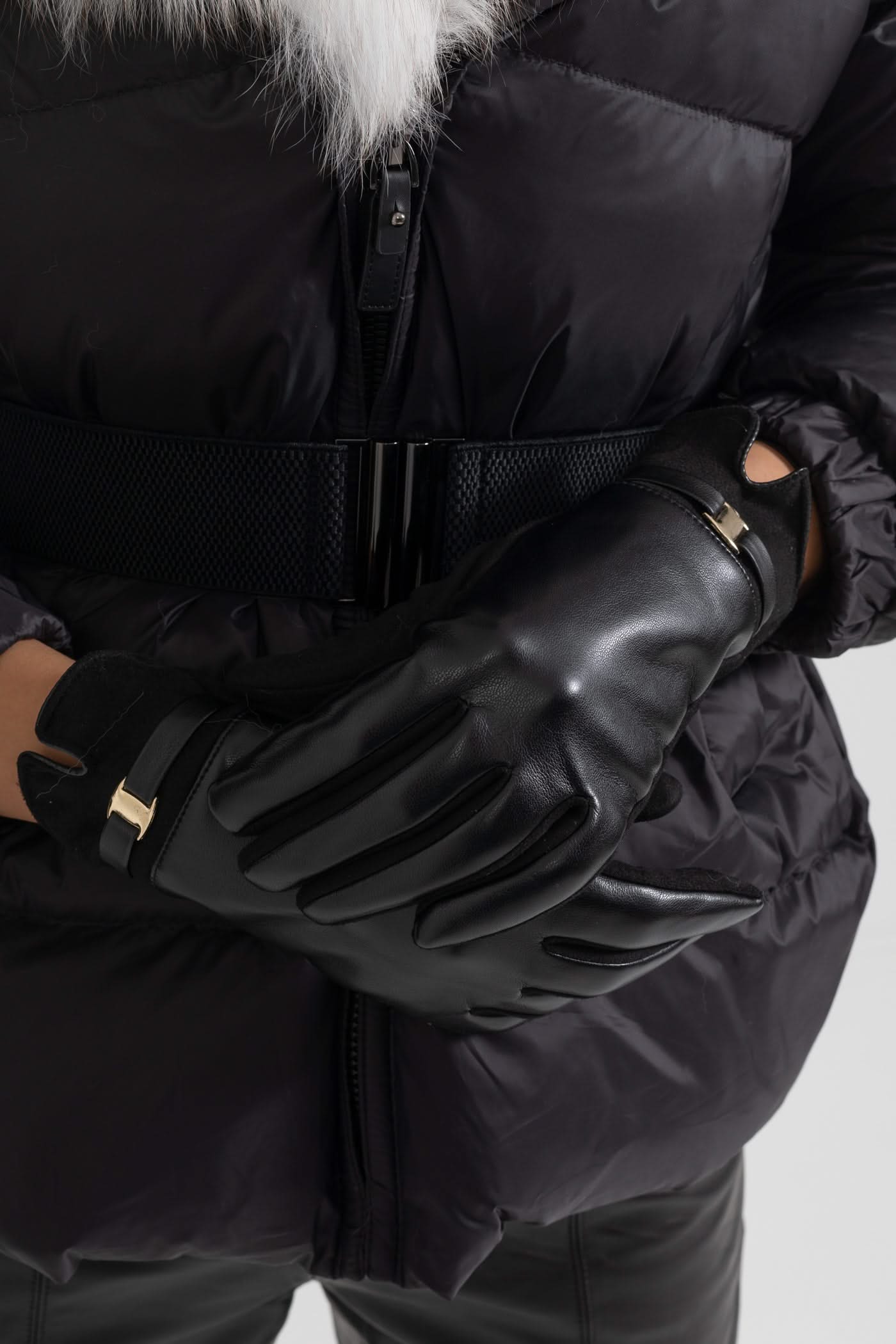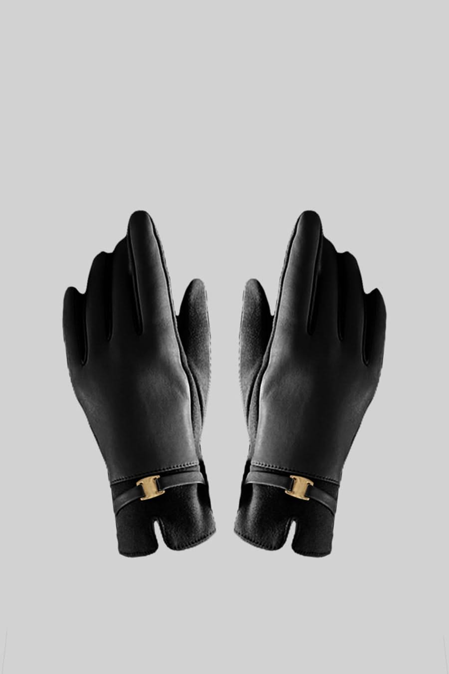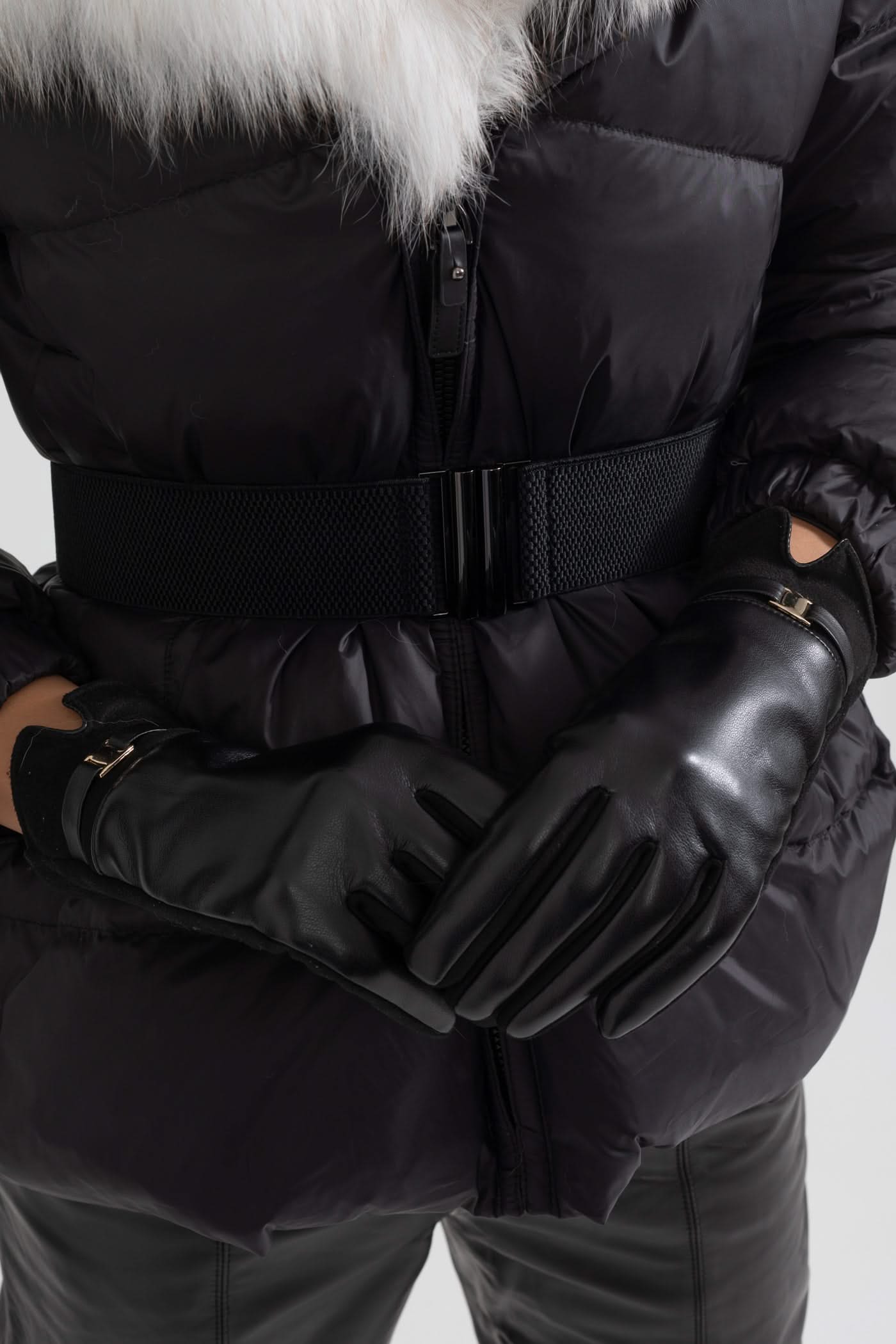 Altın Tokalı Vegan Deri Ve Süet Eldiven - Siyah