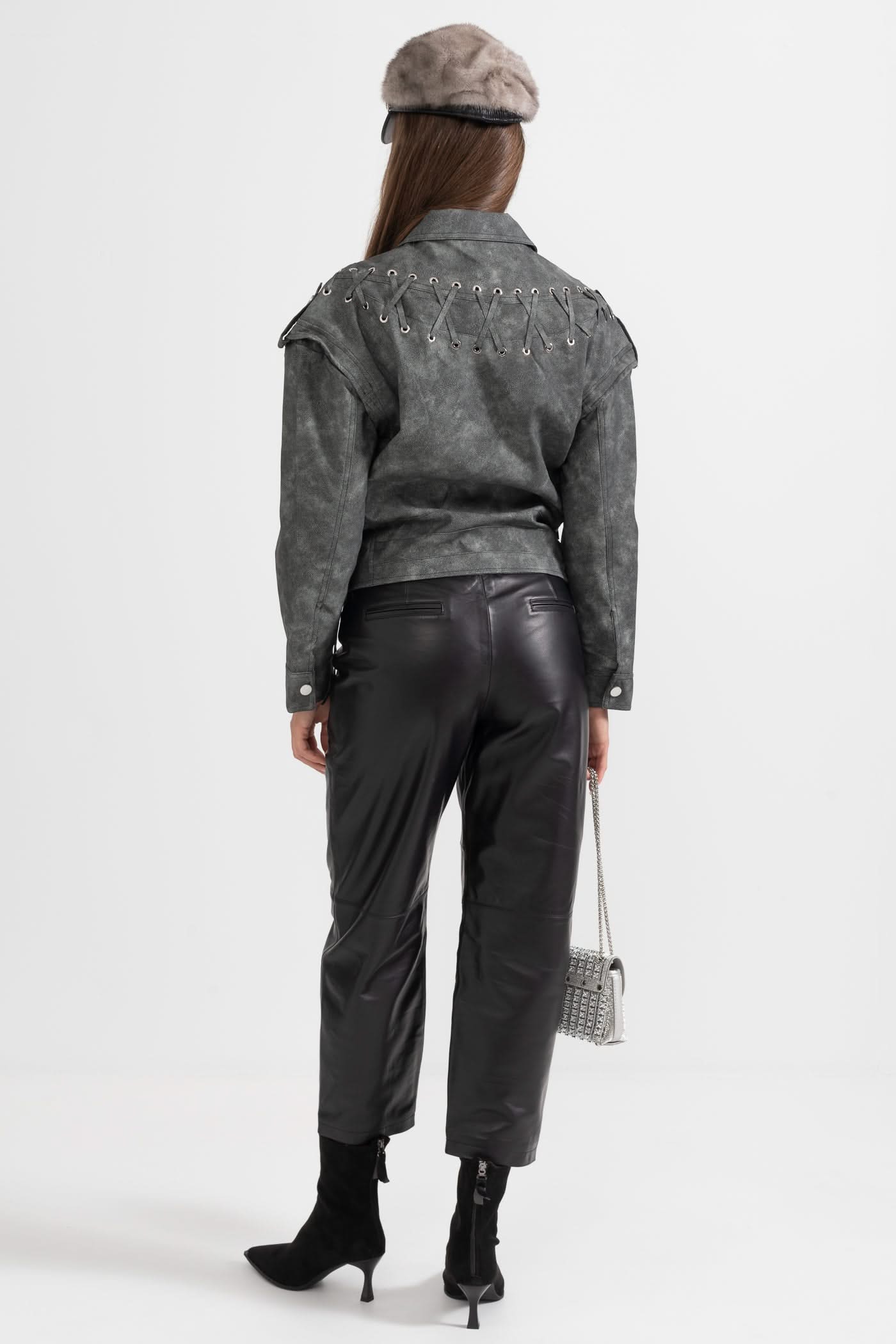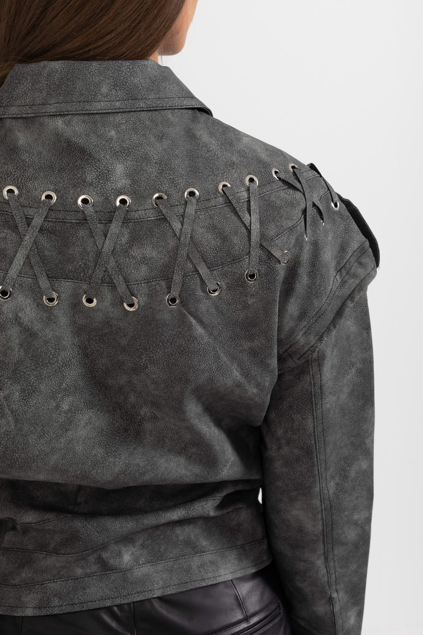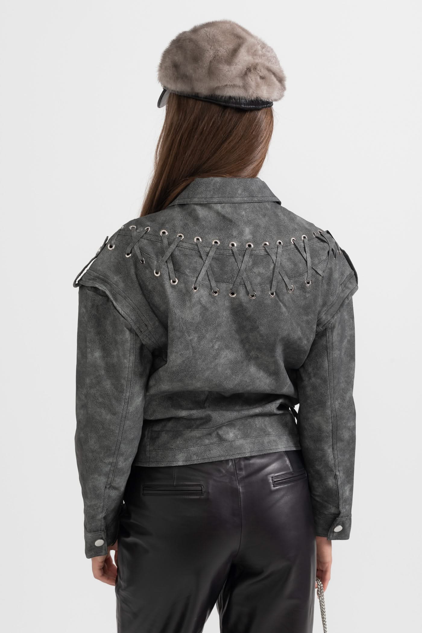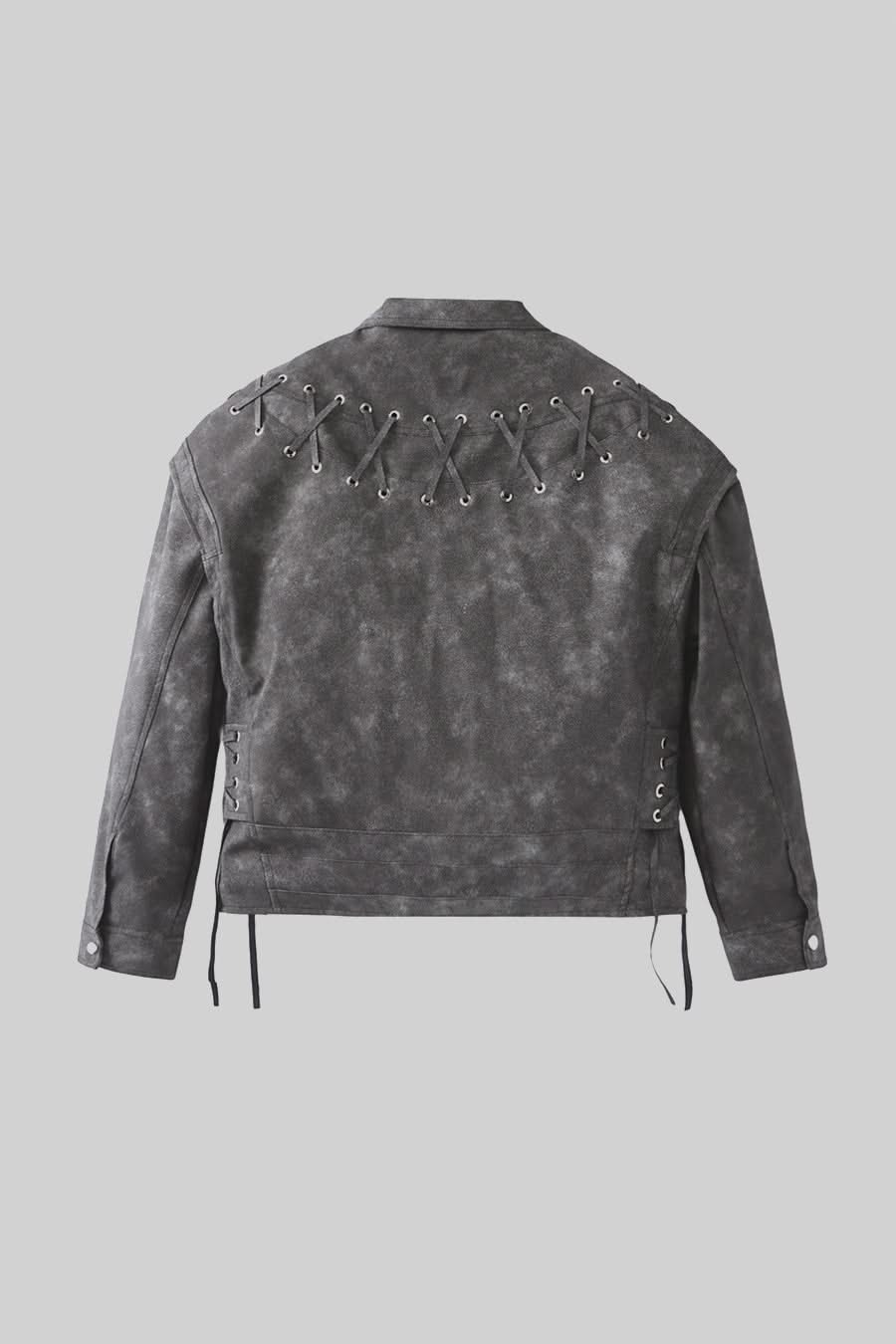 Dikişli Sırt Detaylarına Sahip Vegan Deri Ceket - Kömür