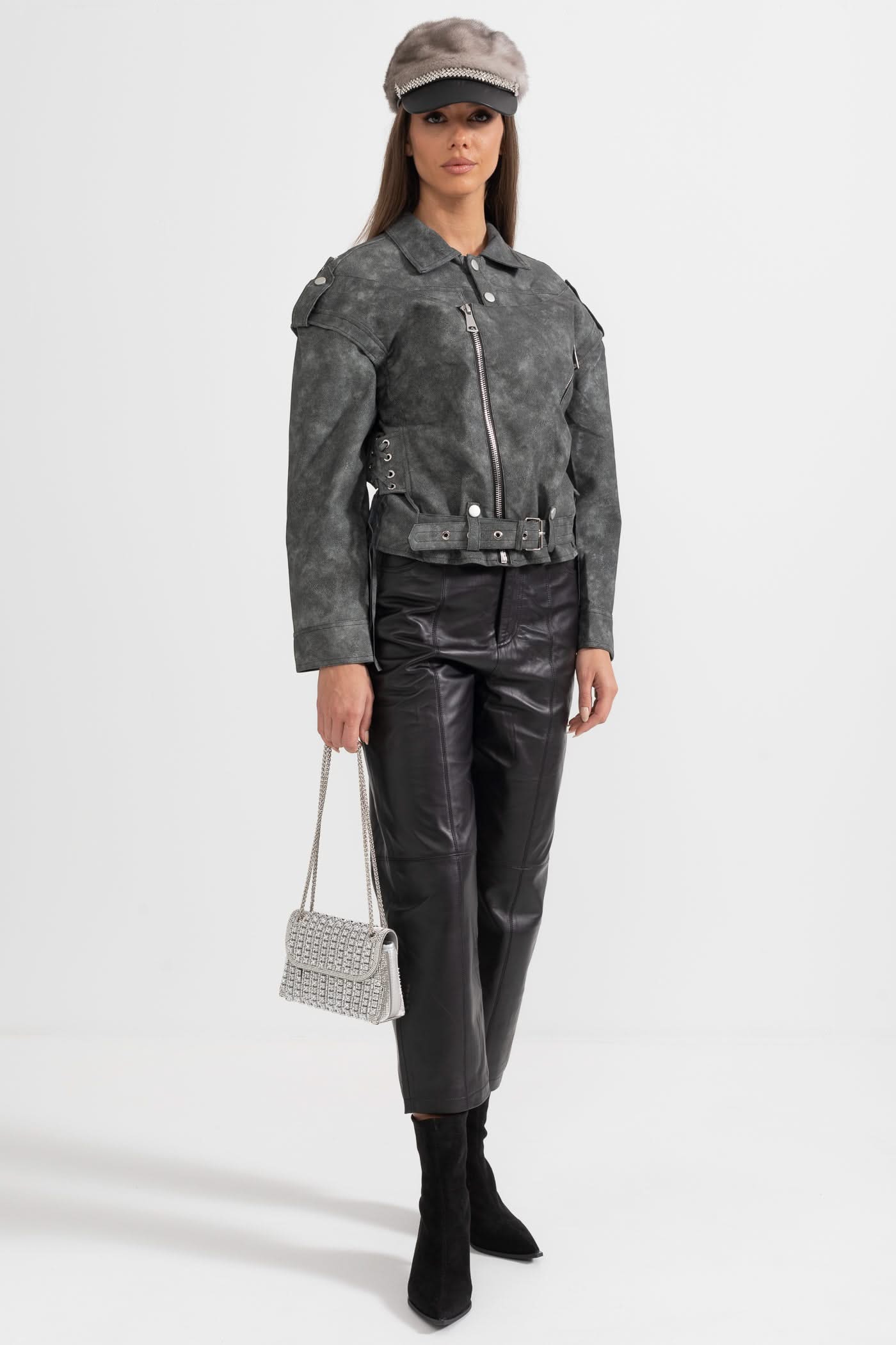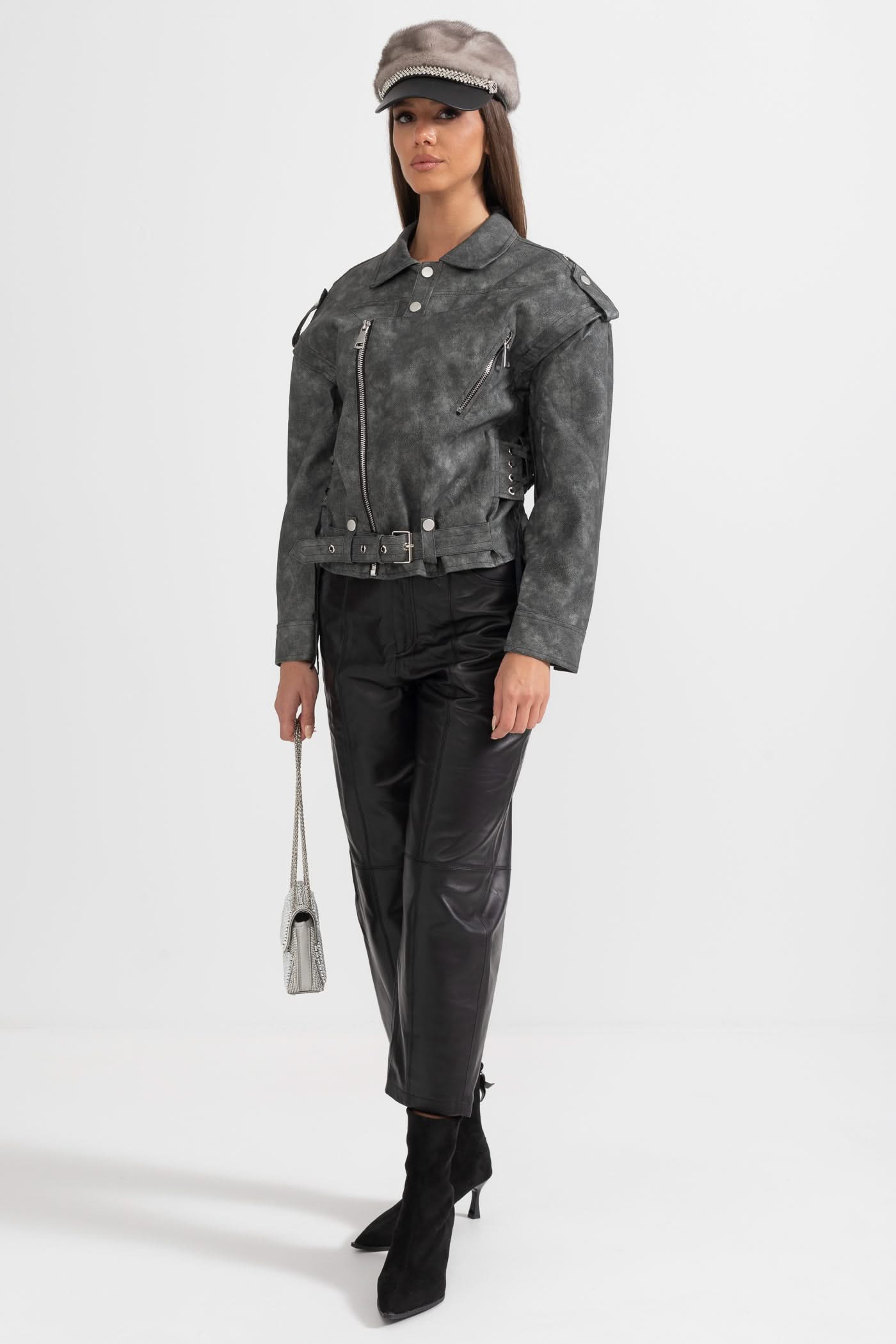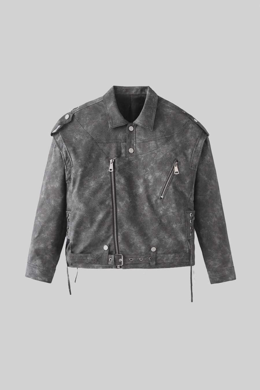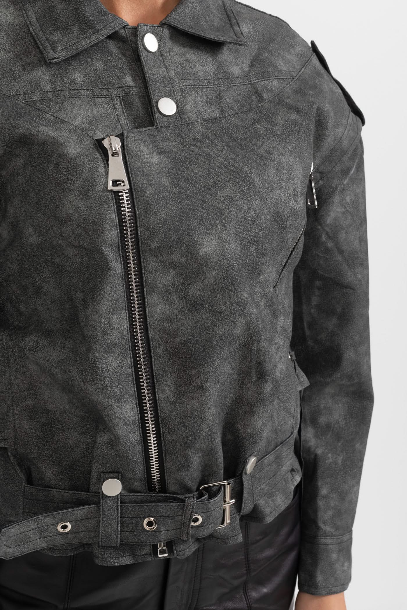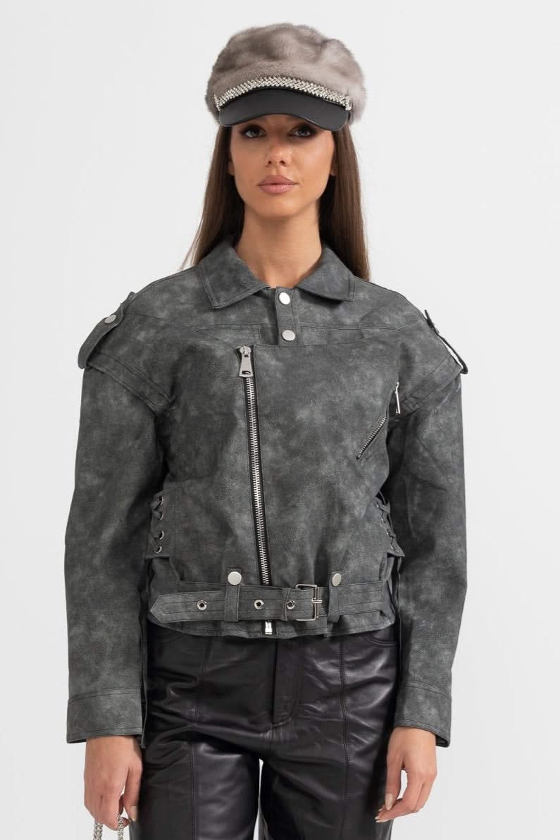 Dikişli Sırt Detaylarına Sahip Vegan Deri Ceket - Kömür