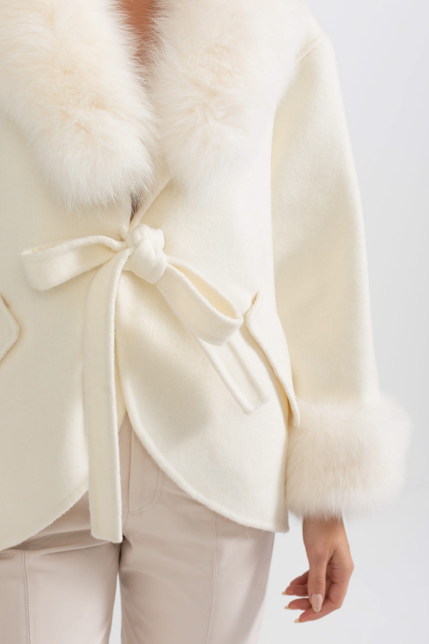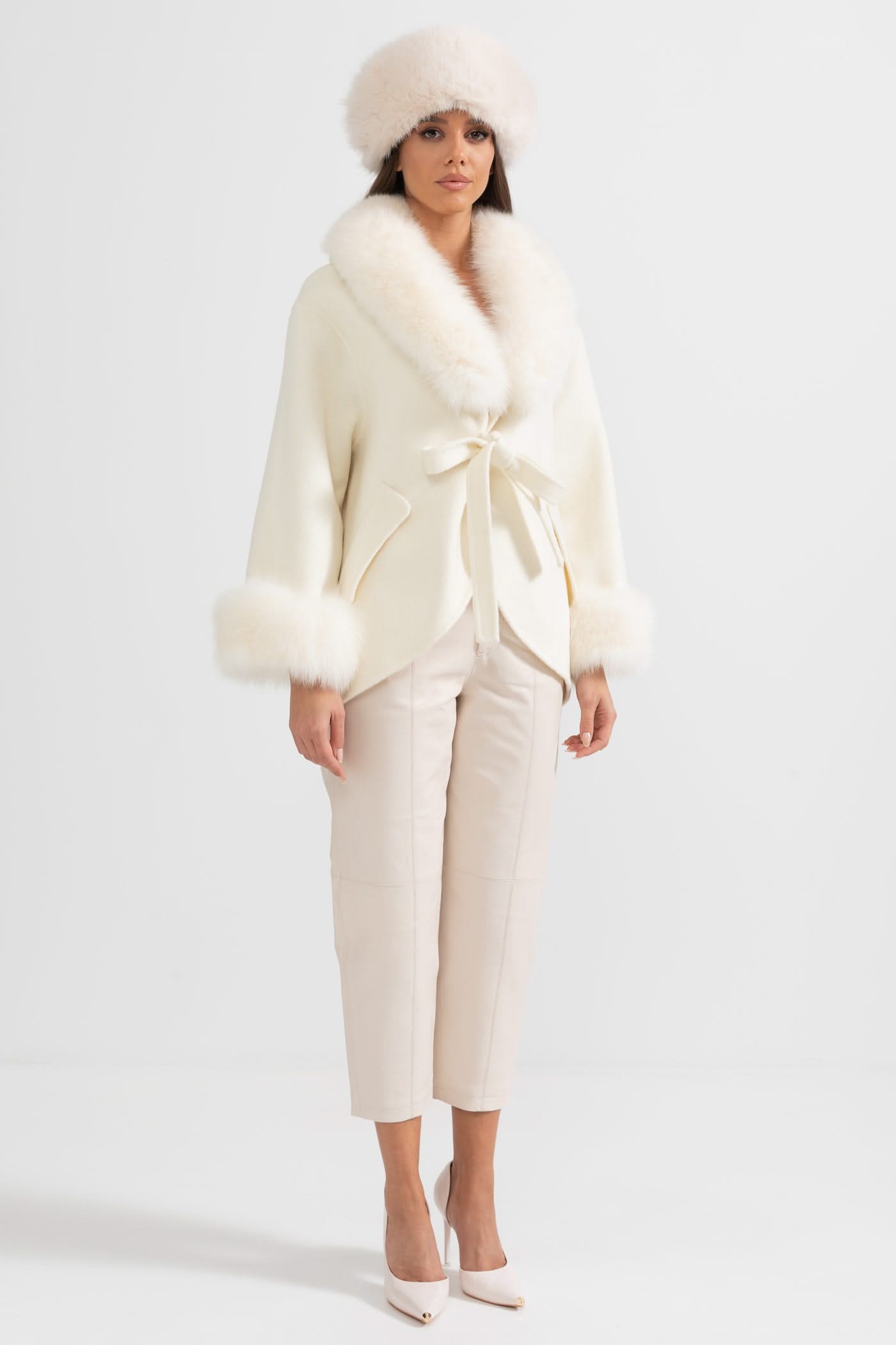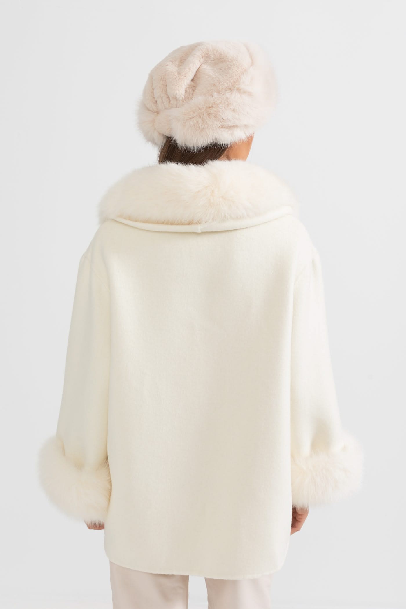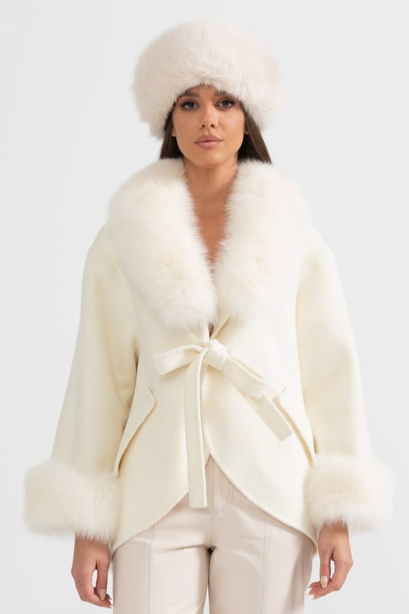 Büyük Boy Tilki Kürk Yakalı Kaşmir Palto - Kırık Beyaz